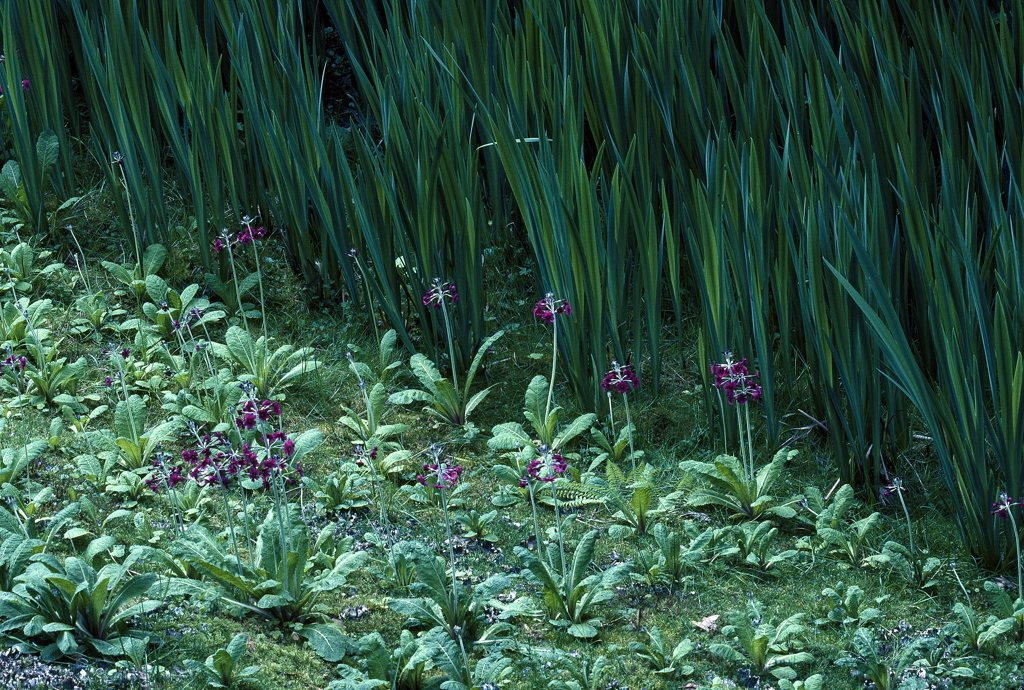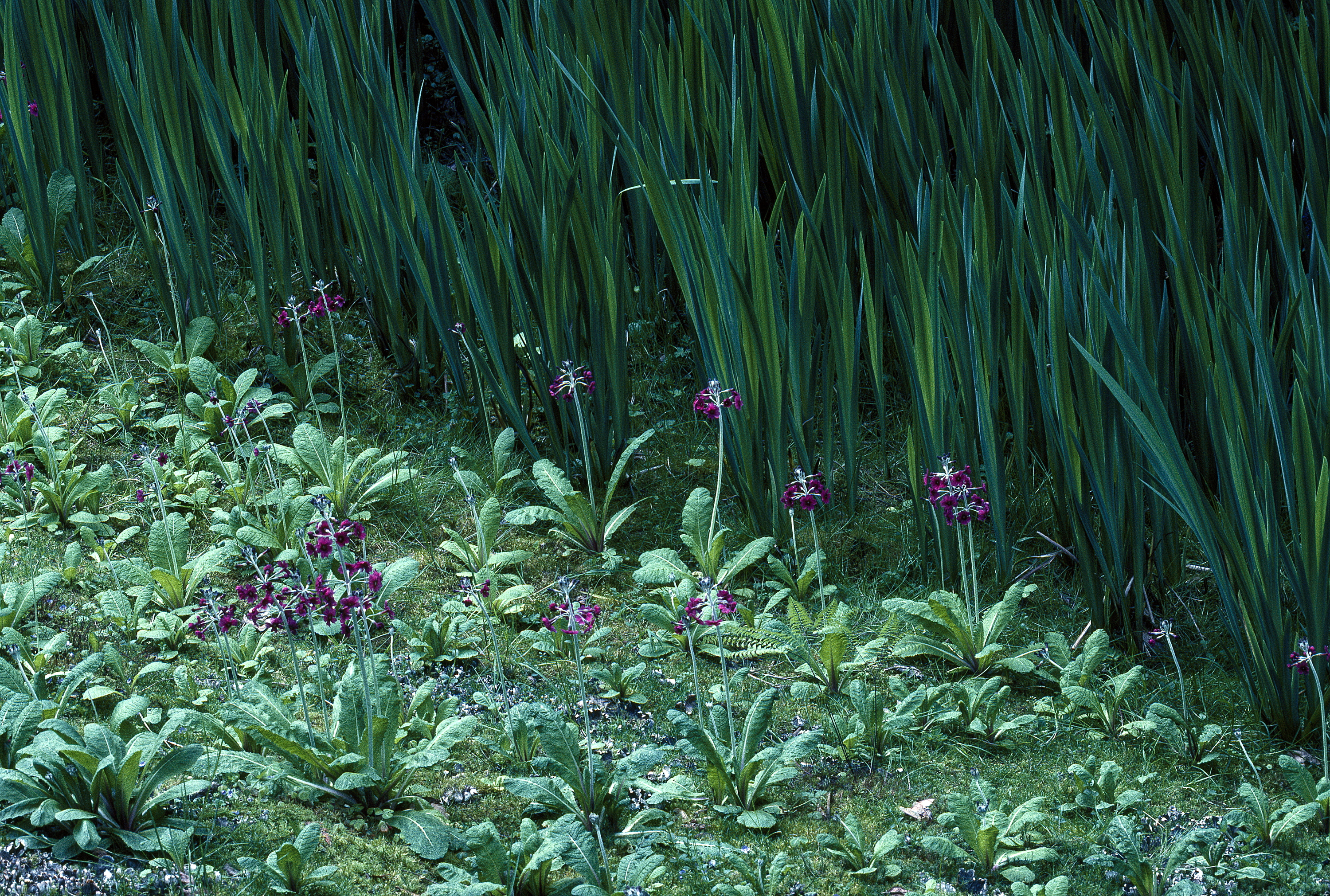 general view, primroses (Primula pulverulenta) in bloom, 1990