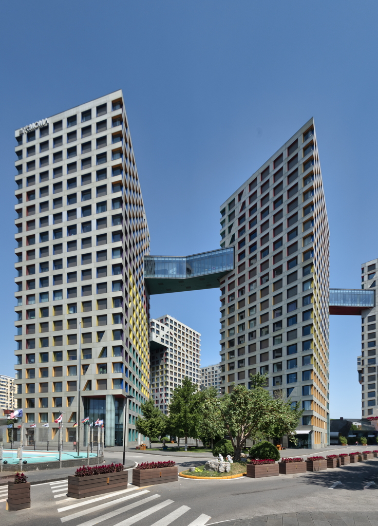 general view, three complex buildings connected by skywalks, 2019