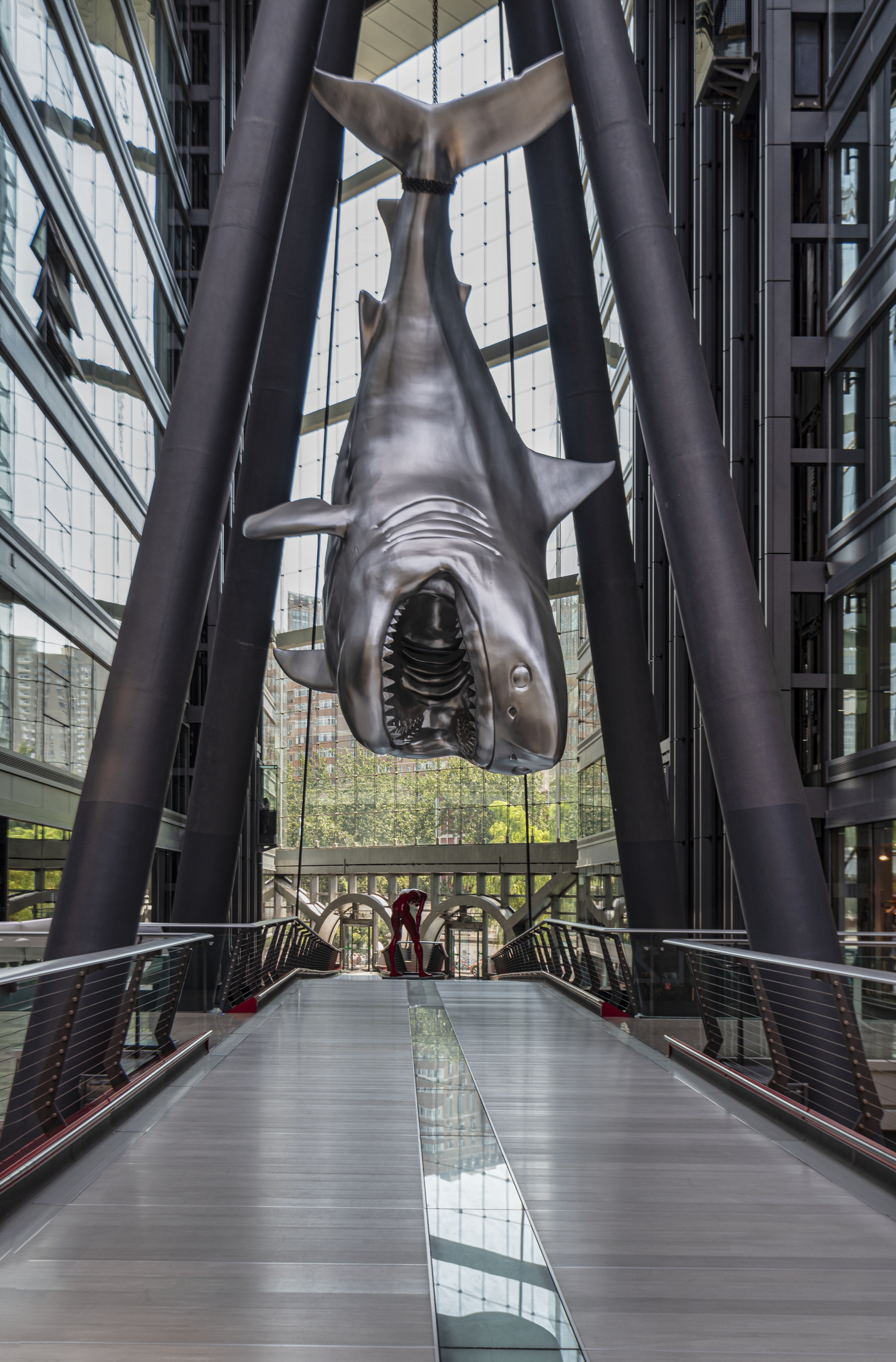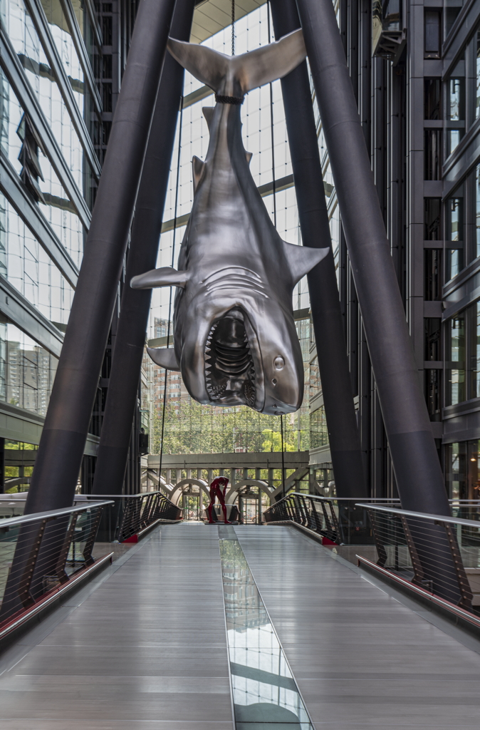 general view, shark sculpture hanging in the mall, 2019