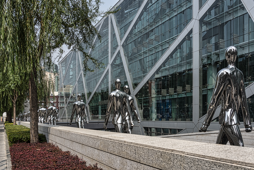 general view, row of figurative sculptures that appear to walk next to the mall, 2019