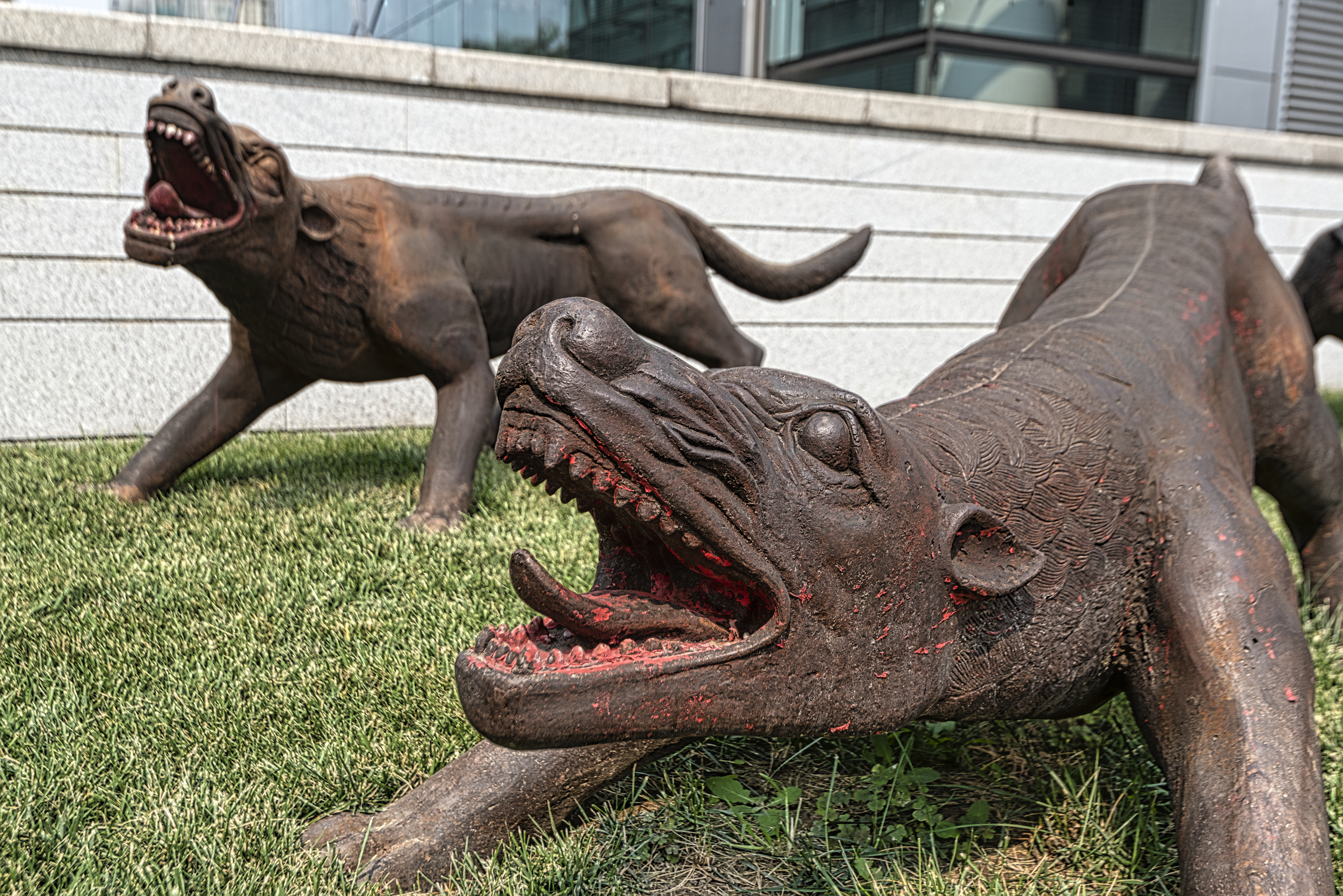 general view, sculpures of dogs outside the mall, 2019