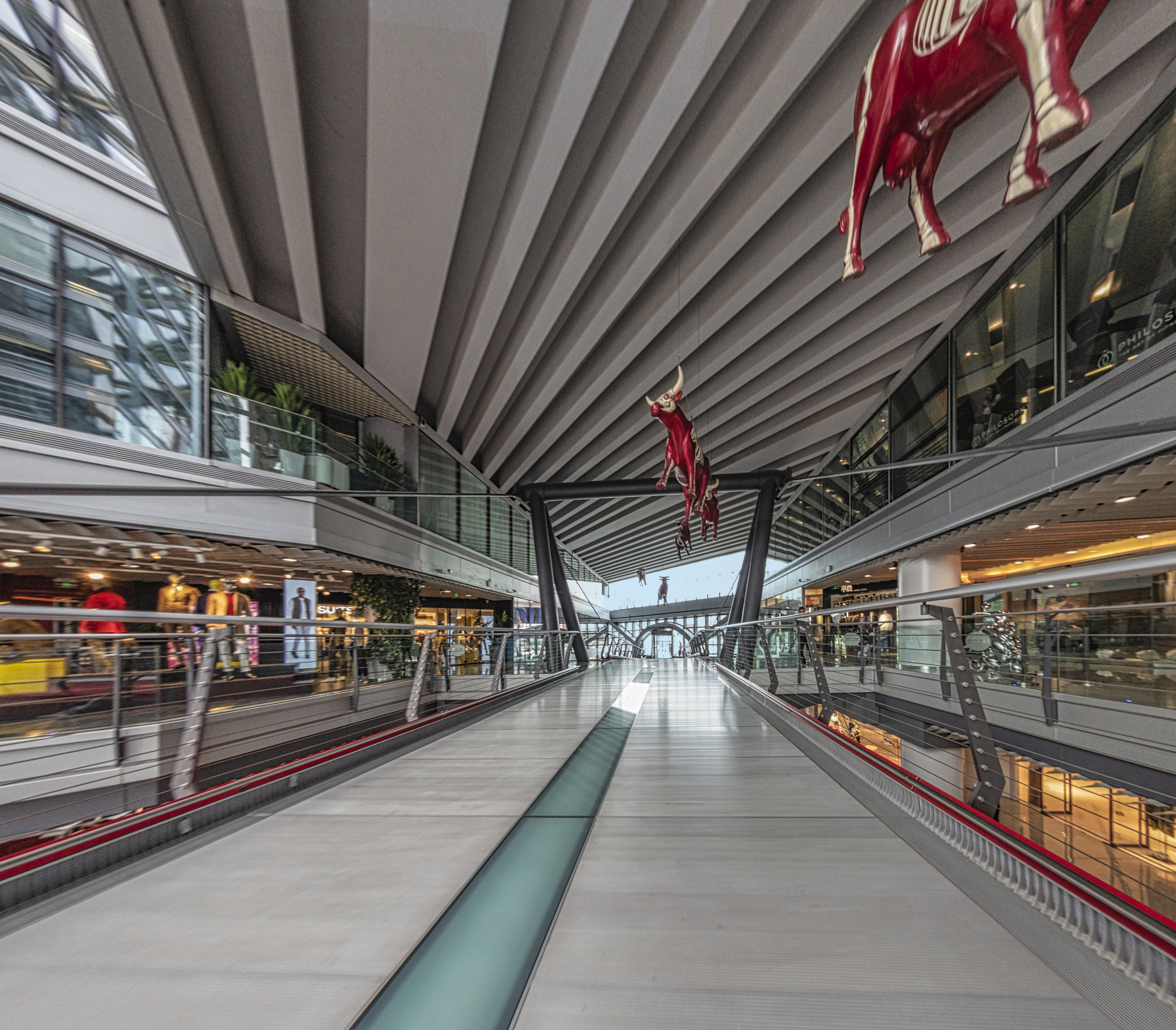 general view, sculptures of cows hanging in the mall atrium, 2019
