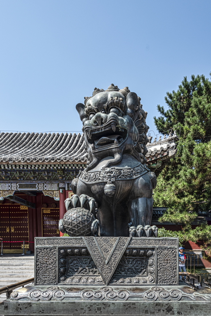 general view, bronze Foo Dog, or guardian lion sculpture, in front of the East Palace Gate, 2019