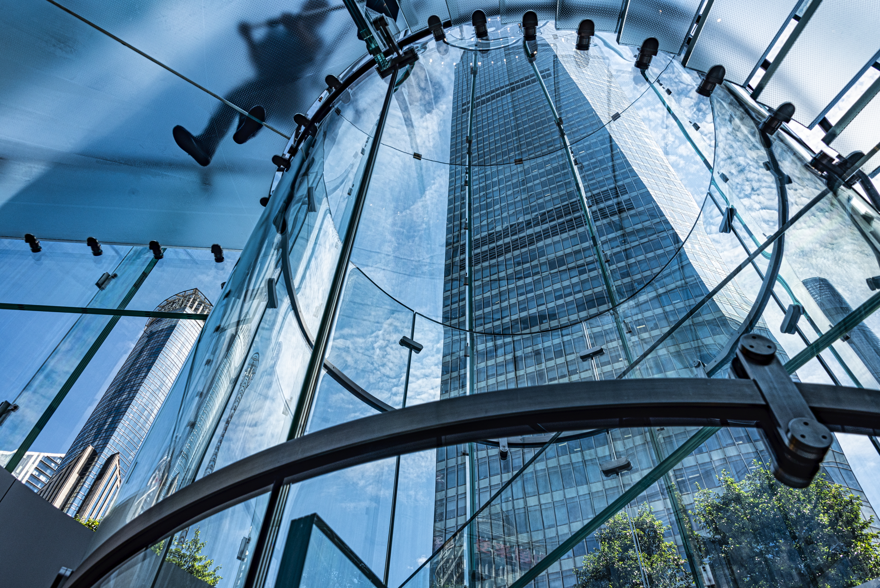 interior, skyscraper seen through the circular glass entrance to the store, 2019