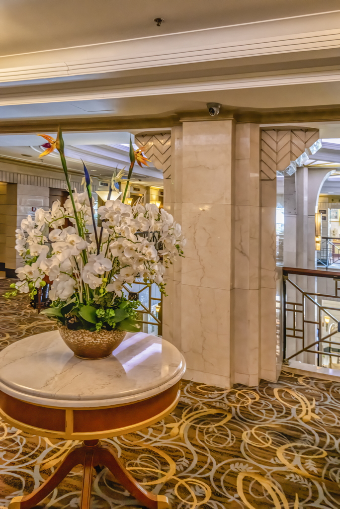 interior, table with decorative orchid in a mezzanine corridor, 2019