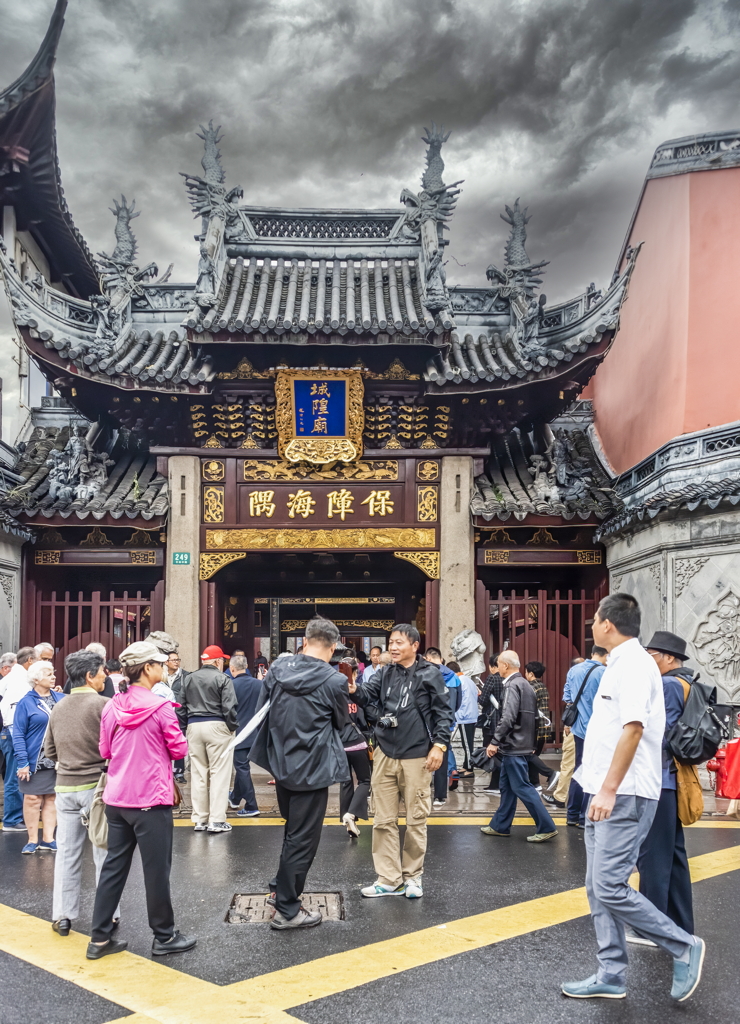 general view, tourists at a paifang (architectural arch) adjacent to the City God Temple, 2019