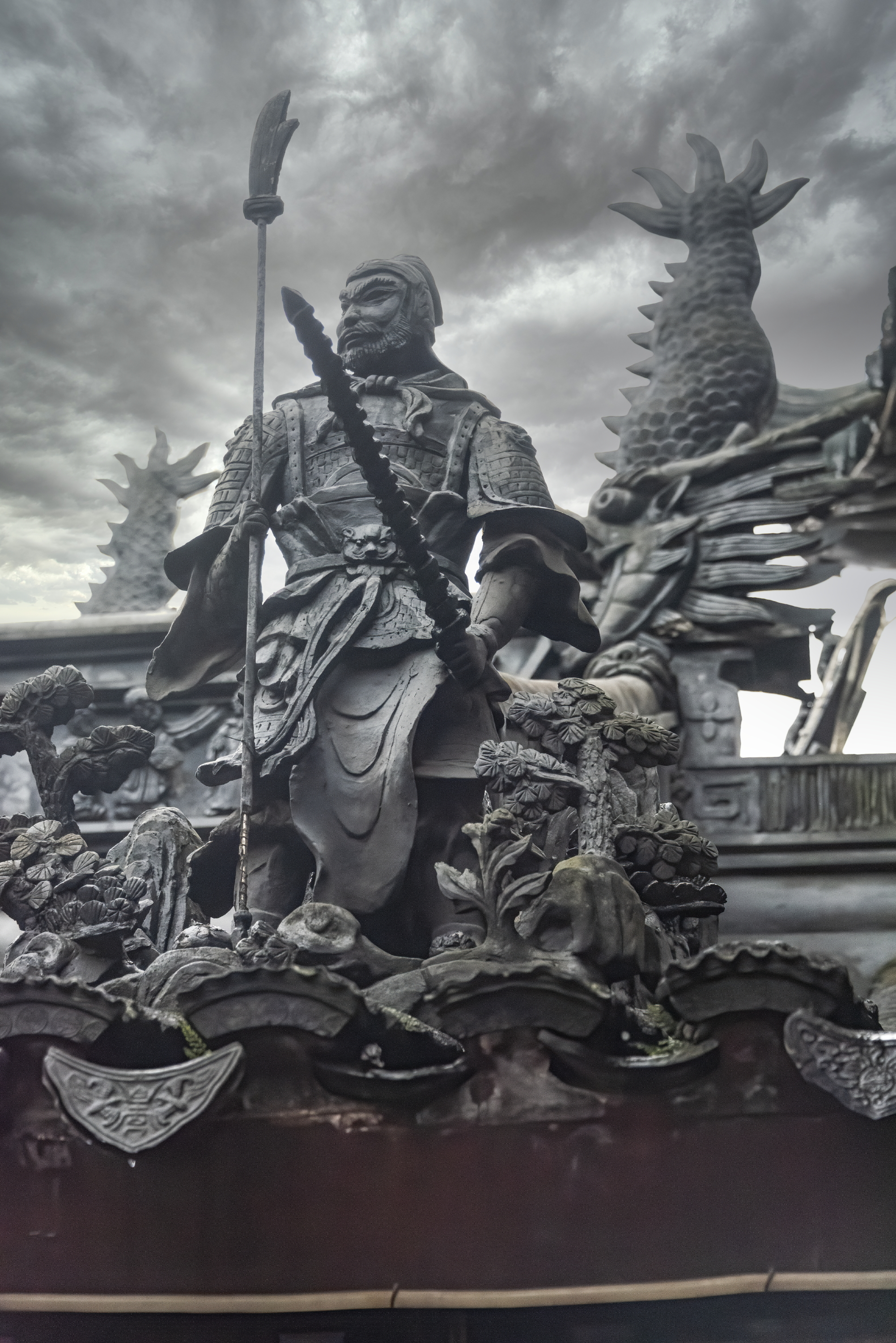 exterior, sculptures of warrior on the roof of a gate (paifang) adjacent to the City God Temple, 2019