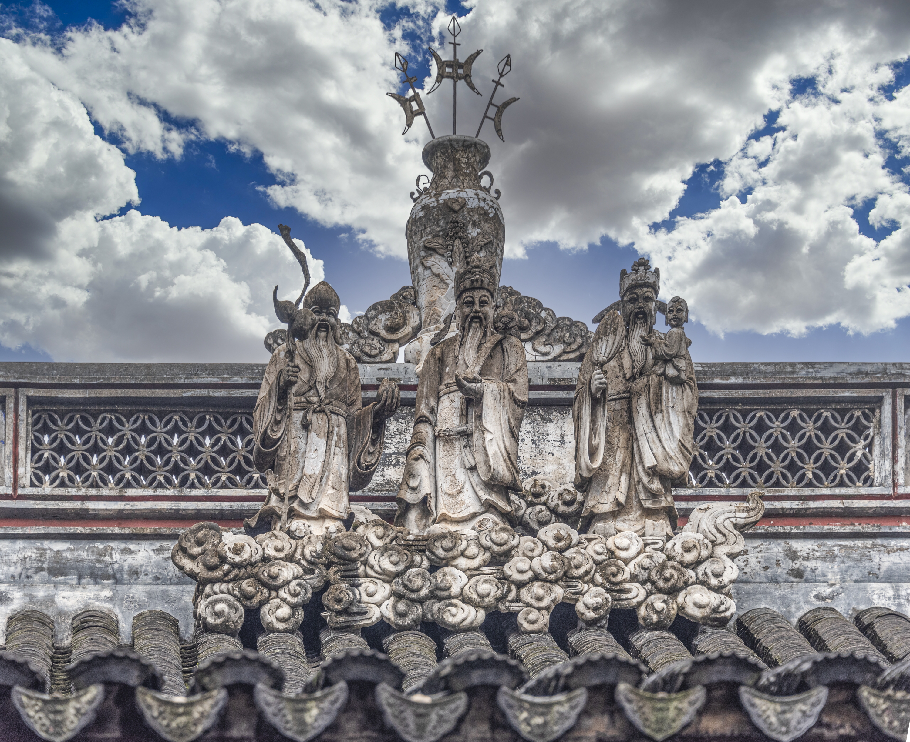 exterior, sculptures of famous philosophers on the roof of a gate (paifang) adjacent to the City God Temple, 2019
