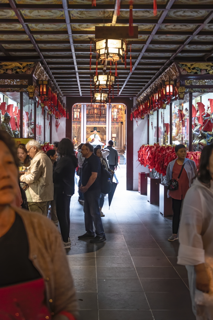 interior, tourists viewing display cases at the temple, 2019