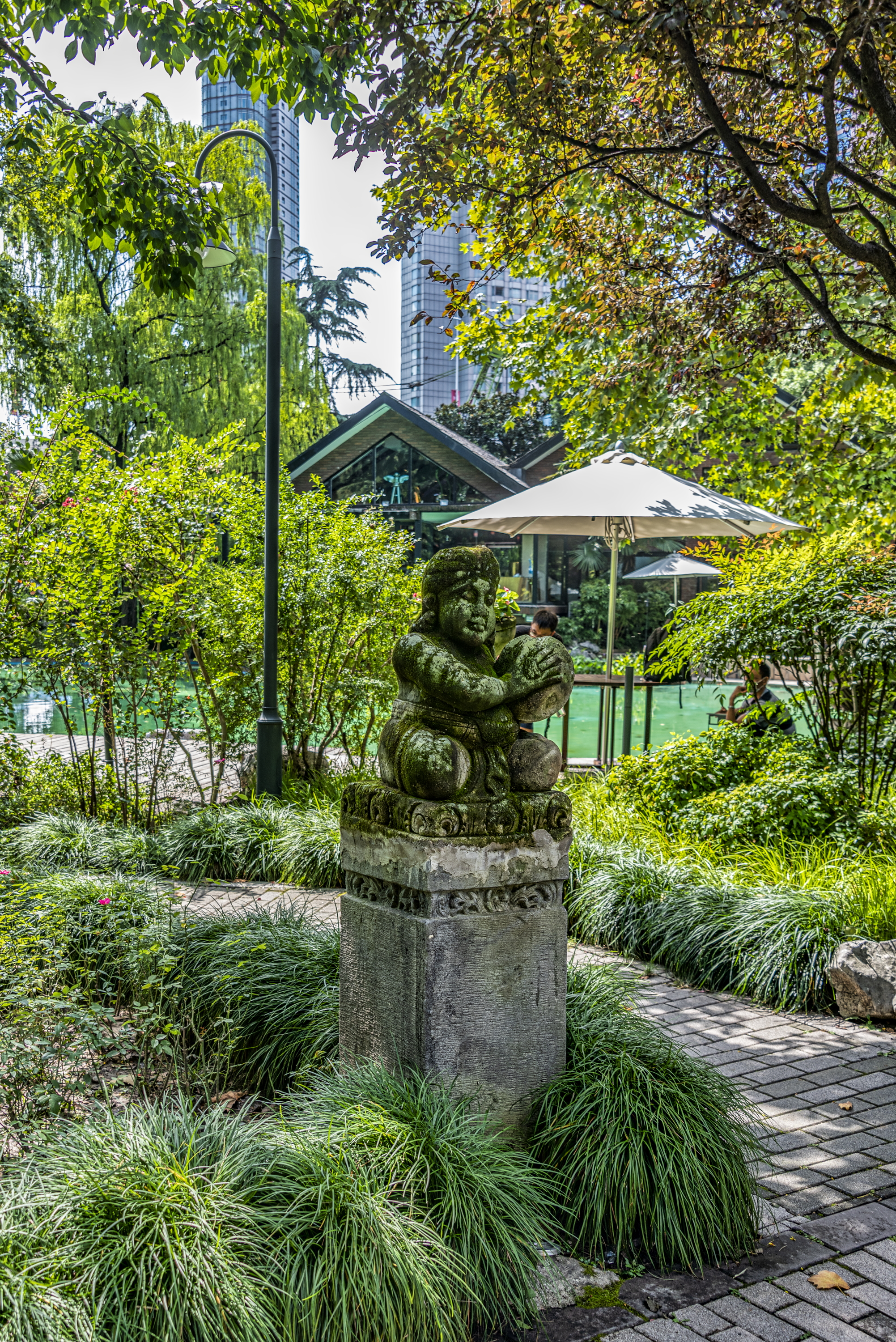 general view, moss-covered stone statue, 2019