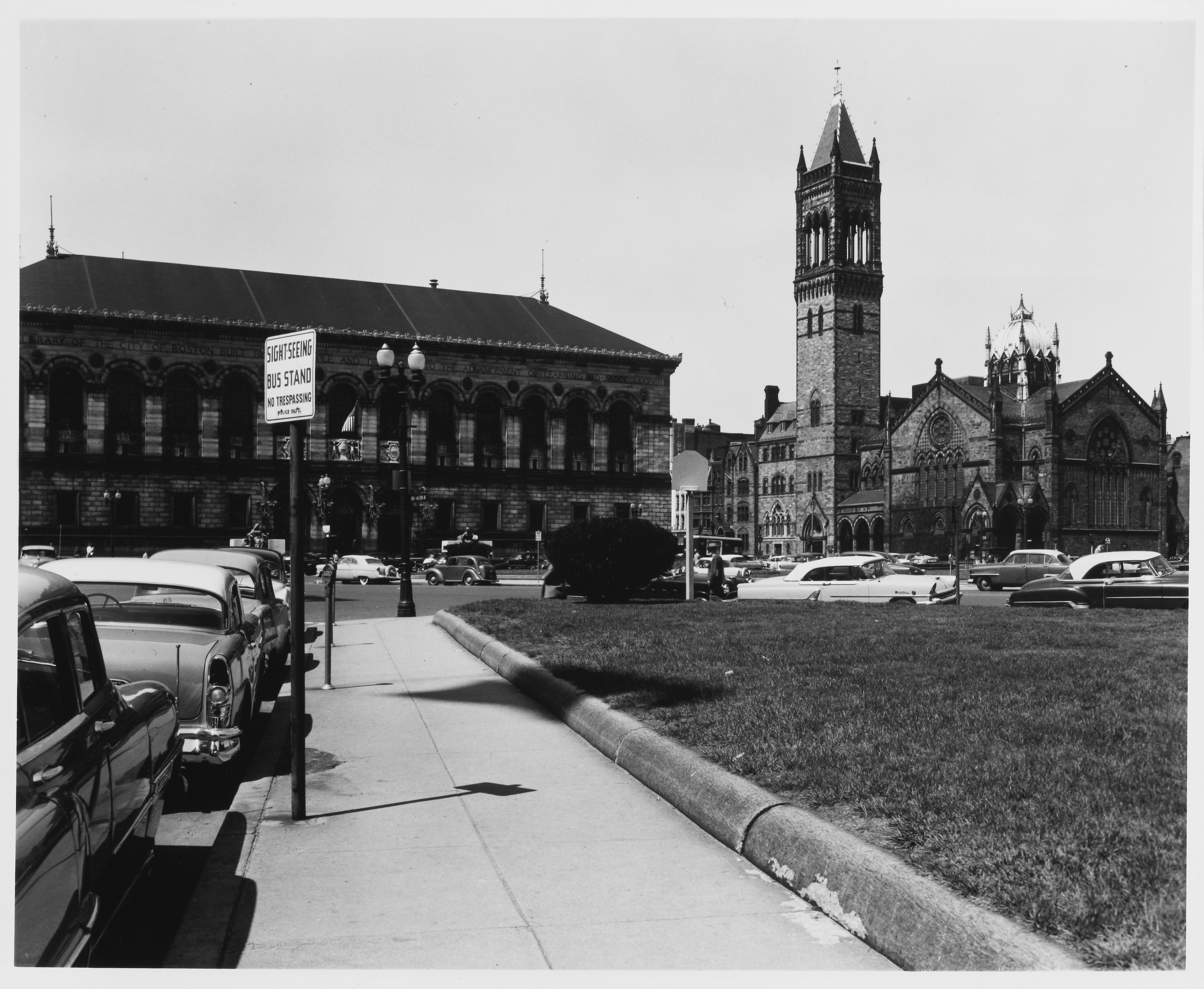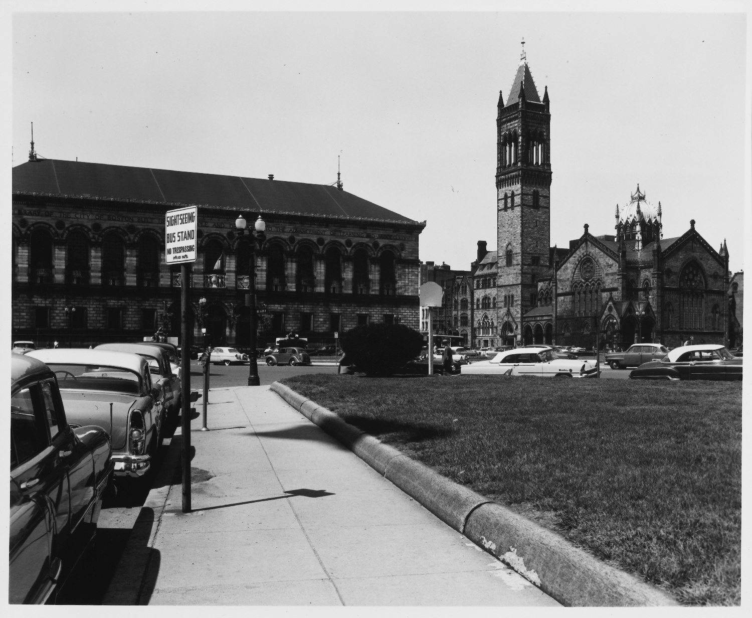 Towers (Building divisions), Boston (Mass.), City and town life, Bus stops, Greens (open spaces), Massachusetts Institute of Technology, Urban areas, Land use, Urban, City planning, Public spaces, Urban planning and environment, Documentary photography, Copley Square (Boston, MA), Boston Public Library, (Boston, MA), Kepes/Lynch Photograph Collection, Old South Church (Boston, Mass.)