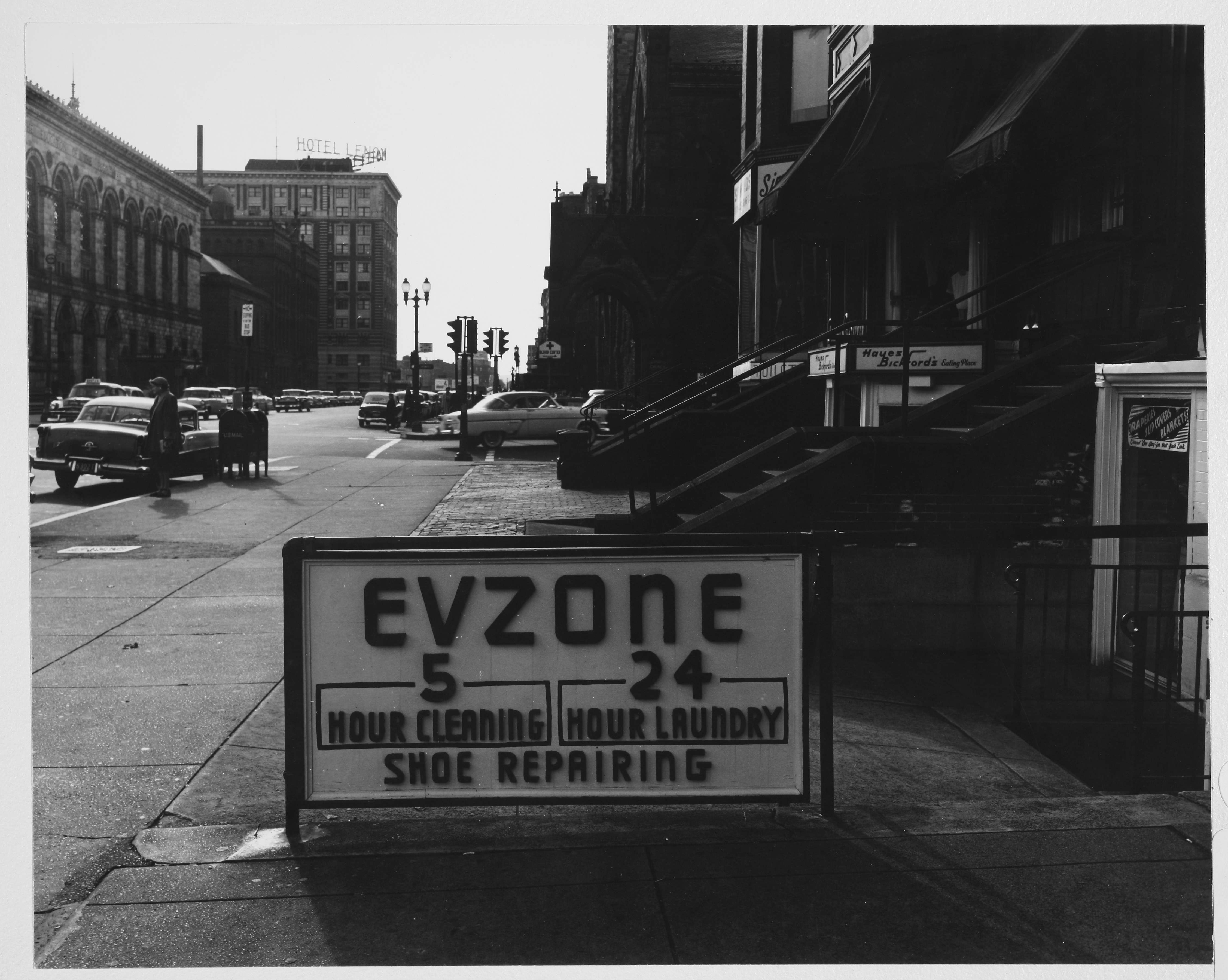 Stairs, Shop signs, Stores, Retail, Boston (Mass.), City and town life, Massachusetts Institute of Technology, Urban areas, Land use, Urban, City planning, Storefronts, Urban planning and environment, Documentary photography, Copley Square (Boston, MA), Boston Public Library, (Boston, MA), Copley Square Signs, (Boston, MA), Kepes/Lynch Photograph Collection, Old South Church (Boston, Mass.)
