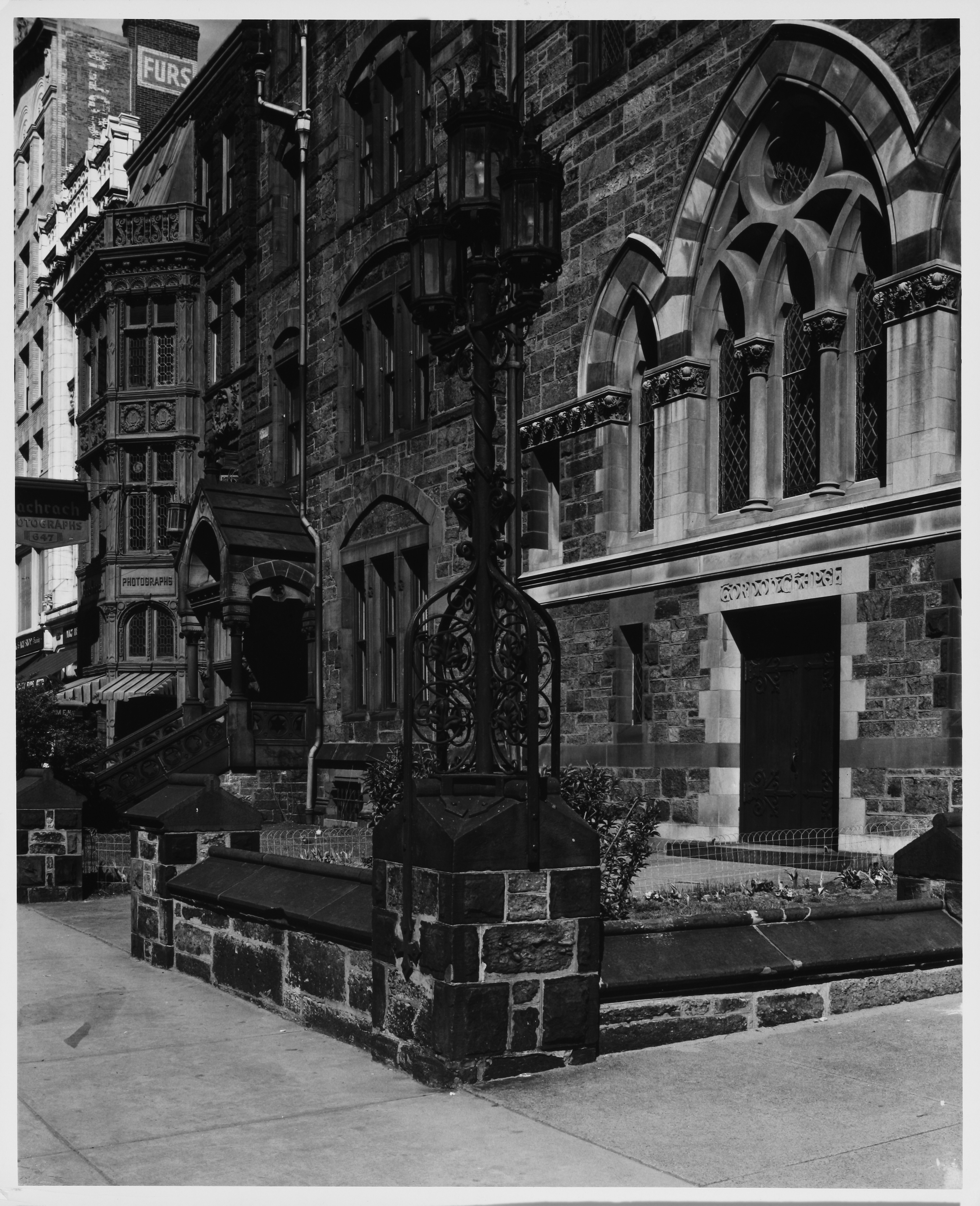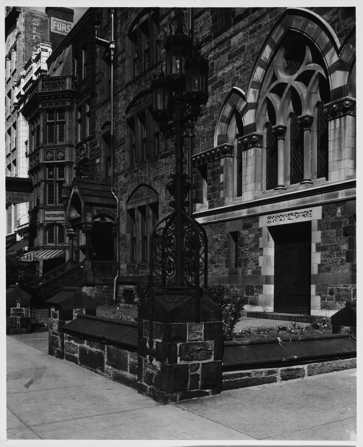 Street Furniture: Iron, Triple-Lamp Street Light, with Gothic Arched Windows in Background