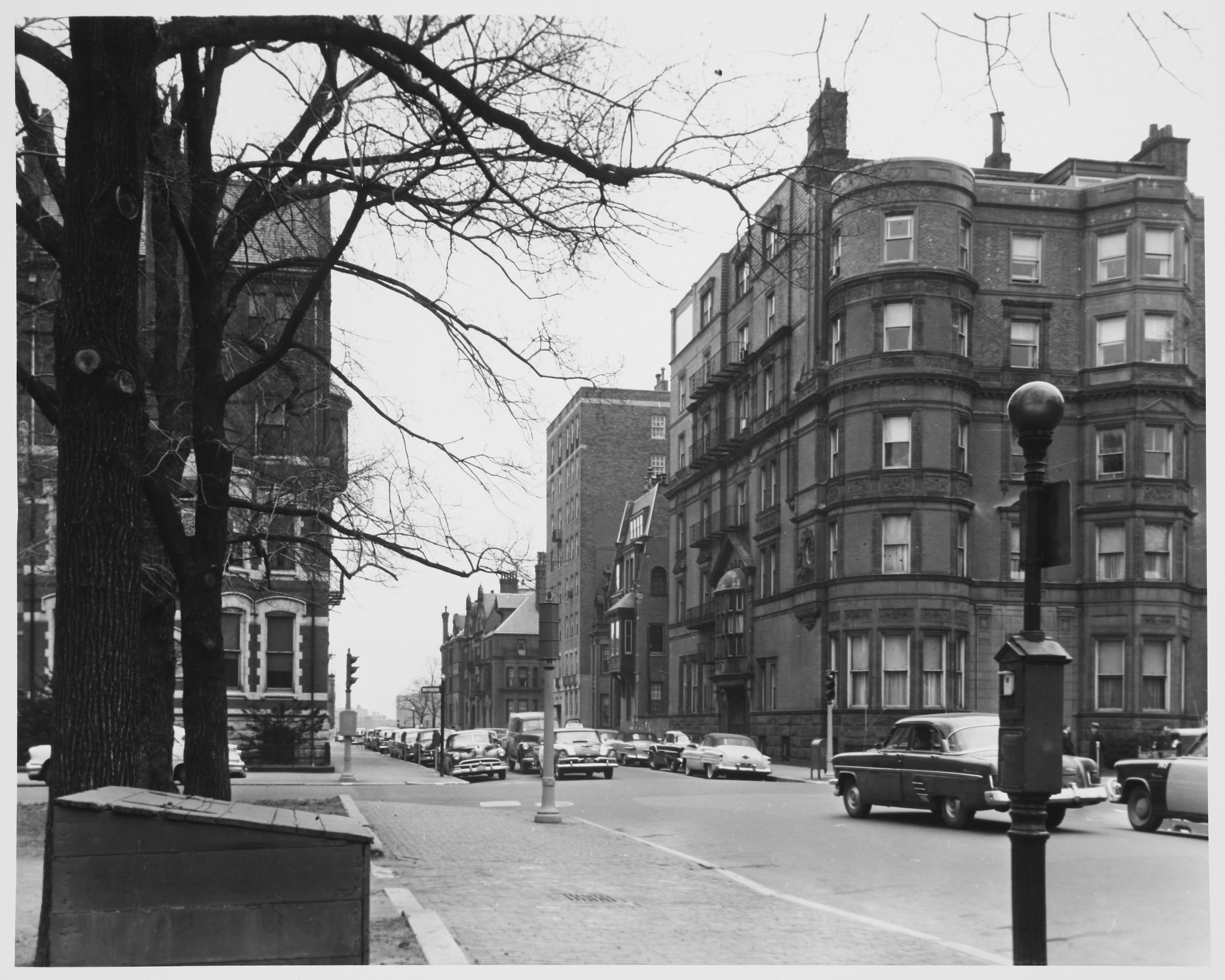 Rustication, Boston (Mass.), Street furniture, City and town life, Street lighting, Chimneys, Dormers, Row houses, Massachusetts Institute of Technology, Traffic islands, Urban areas, Land use, Urban, City planning, Urban planning and environment, Documentary photography, Architecture, Victorian, Commonwealth Ave., Fairfield to Fens, (Boston, MA), Kepes/Lynch Photograph Collection, Roofing Slate