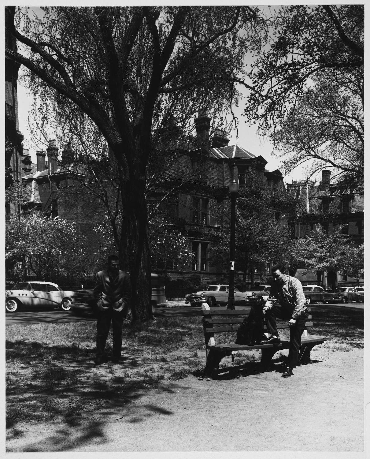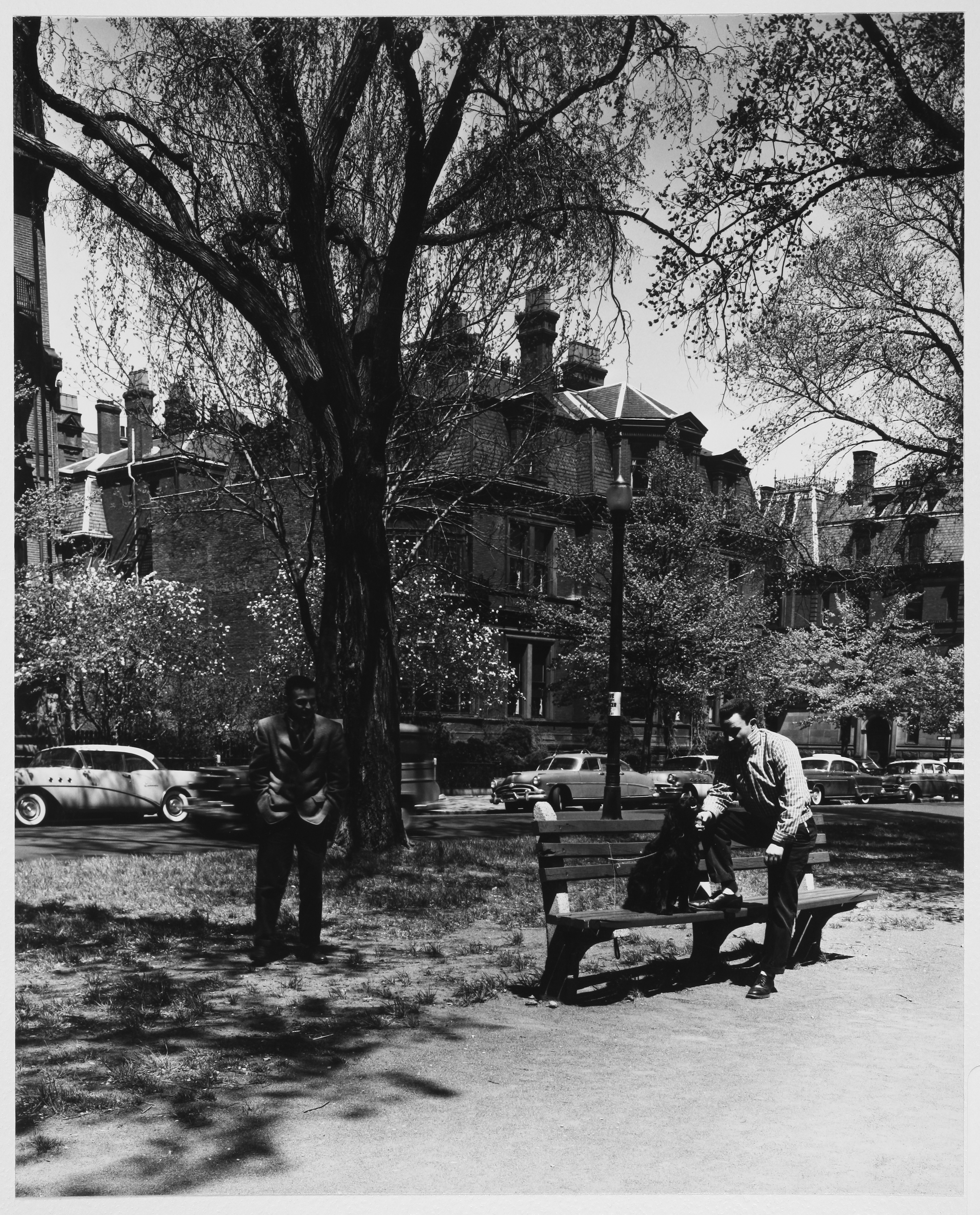 Trees, Boston (Mass.), City and town life, Chimneys, Mansard roofs, Benches, Row houses, Dog walking, Leisure, Massachusetts Institute of Technology, Pedestrians, Urban areas, Land use, Urban, City planning, Urban planning and environment, Documentary photography, Architecture, Victorian, Commonwealth Ave., Fairfield to Fens, (Boston, MA), Kepes/Lynch Photograph Collection, Emerald Necklace, Pedestrian malls