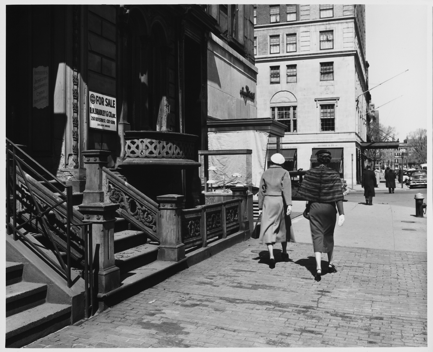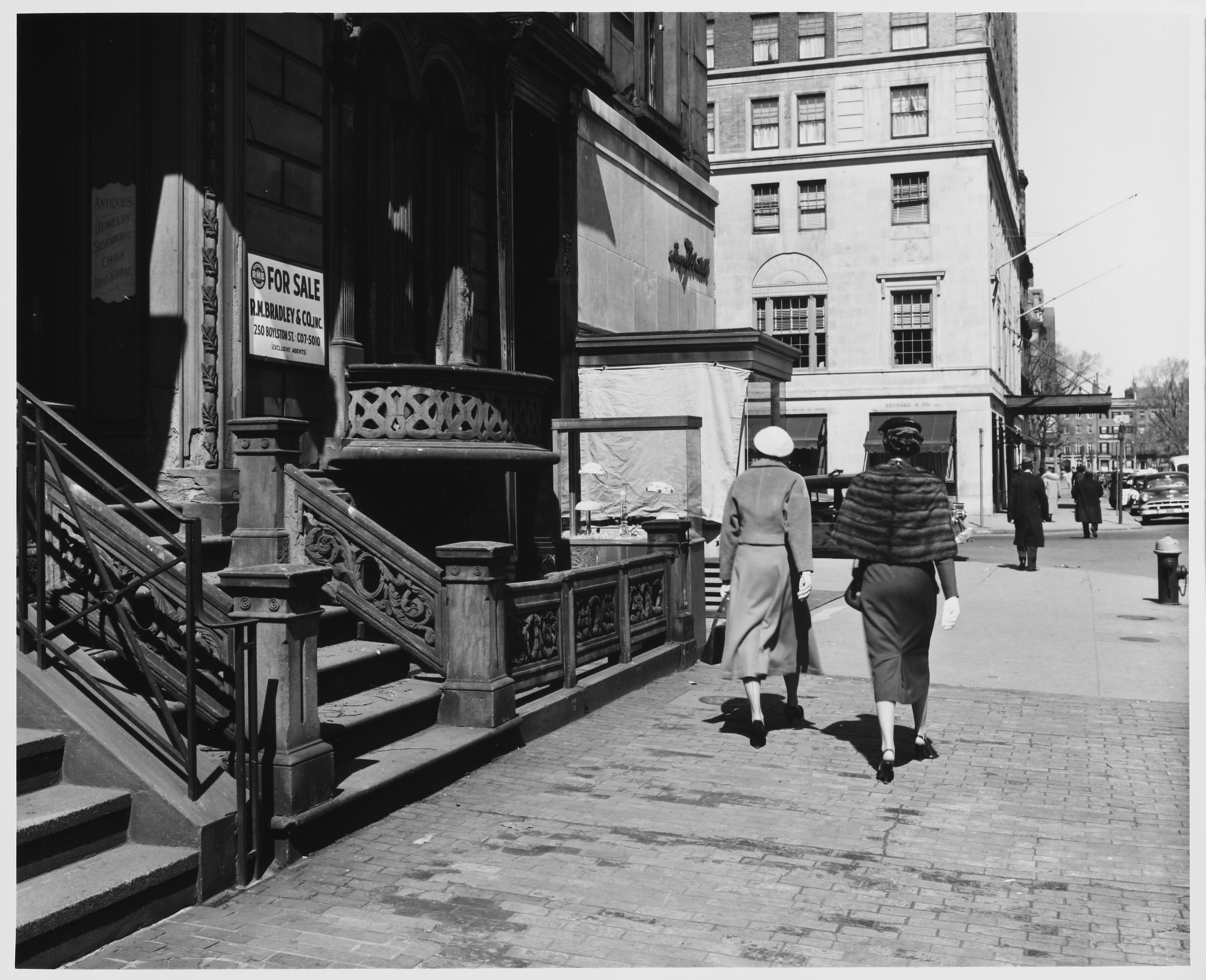 Boston (Mass.), City and town life, Balconies, Women's hats, Massachusetts Institute of Technology, Pedestrians, Urban areas, Land use, Urban, City planning, Clothing and dress, Urban planning and environment, Documentary photography, Kepes/Lynch Photograph Collection, Fur garments, Women's clothing