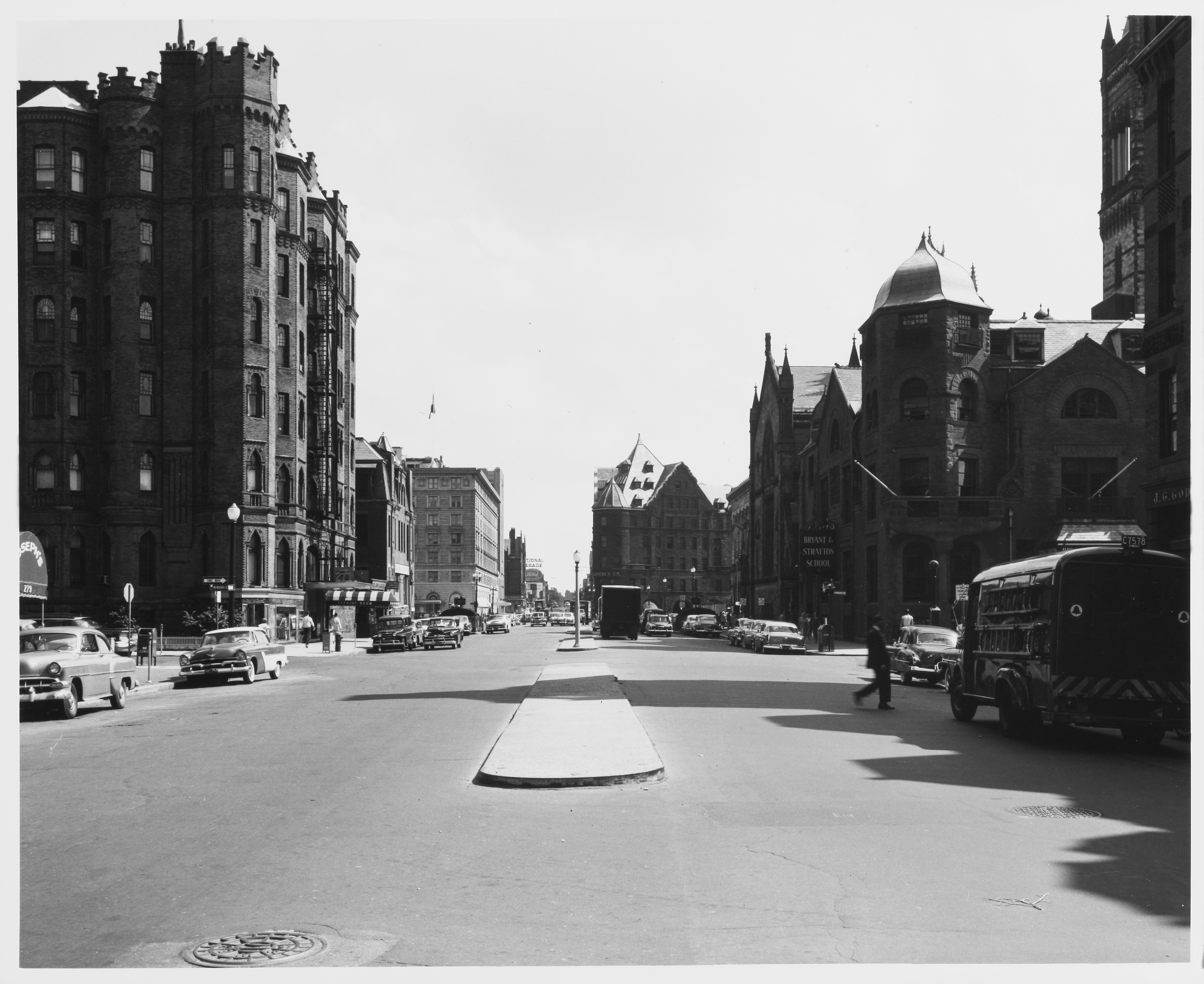 Automobiles, Trucks, Boston (Mass.), City and town life, Back Bay (Boston, Mass.), Massachusetts Institute of Technology, Streetscapes, Urban areas, City traffic, Land use, Urban, City planning, Urban planning and environment, Documentary photography, Sidewalks, Dartmouth Street, (Boston, MA), Kepes/Lynch Photograph Collection, Street lighting units