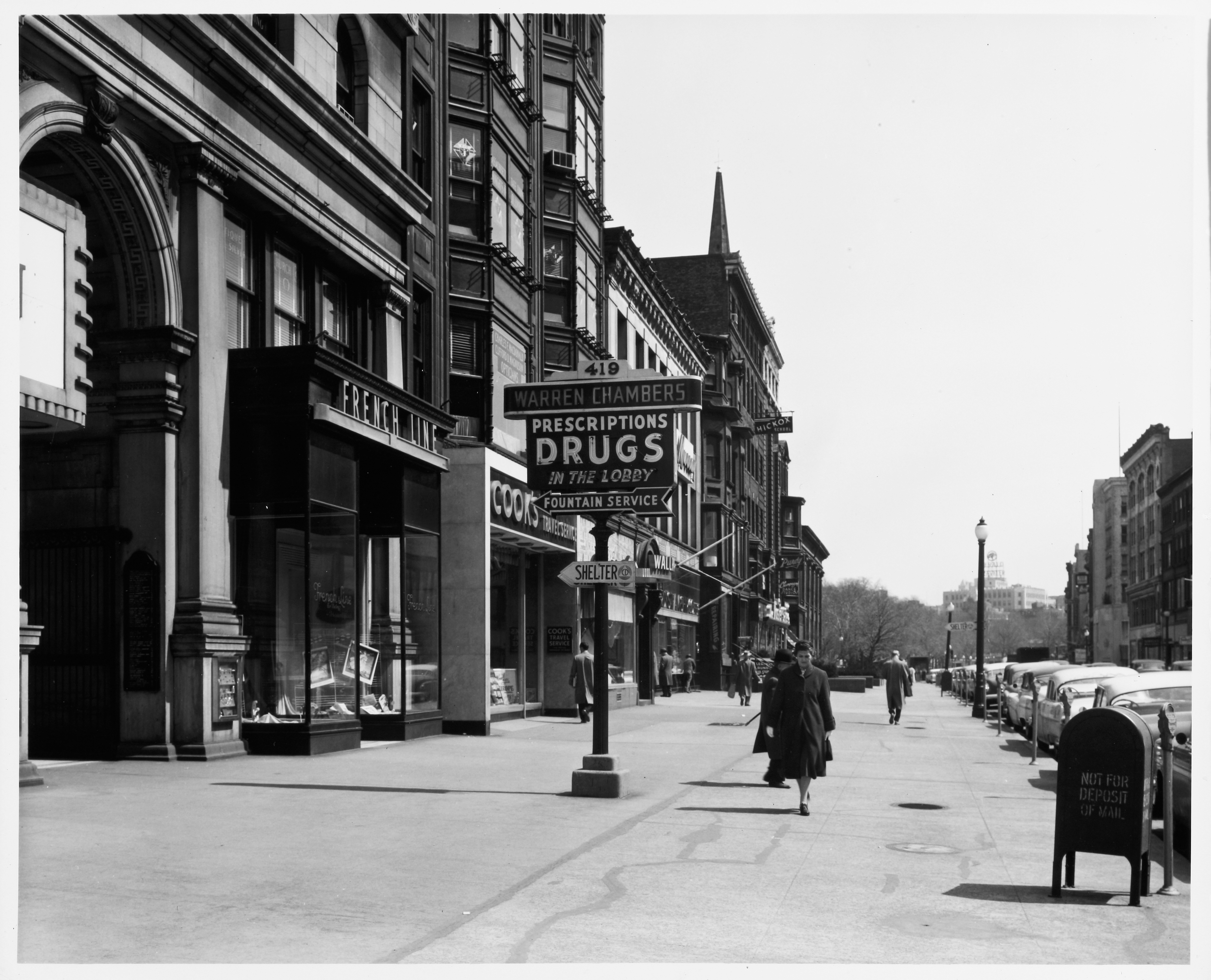 Shop signs, City and town life, Street lighting, Drugstores, Back Bay (Boston, Mass.), Massachusetts Institute of Technology, Streetscapes, Pedestrians, Urban areas, Land use, Urban, City planning, Urban planning and environment, Documentary photography, Sidewalks, Berkeley to Boylston Streets, (Boston, MA), Kepes/Lynch Photograph Collection