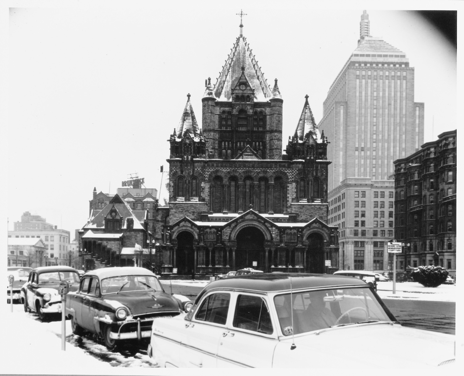 Arches, Automobiles, Boston (Mass.), Snow, City and town life, Turrets (towers), Back Bay (Boston, Mass.), Richardson, H. H. (Henry Hobson), 1838-1886, Massachusetts Institute of Technology, Urban areas, Land use, Urban, City planning, Urban planning and environment, Documentary photography, Romanesque revival (Architecture), Copley Square (Boston, MA), Huntington Avenue, Exeter Street to Copley Square, (Boston, MA), John Hancock Building (Boston, MA), Kepes/Lynch Photograph Collection, Trinity Church (Boston, Mass.)
