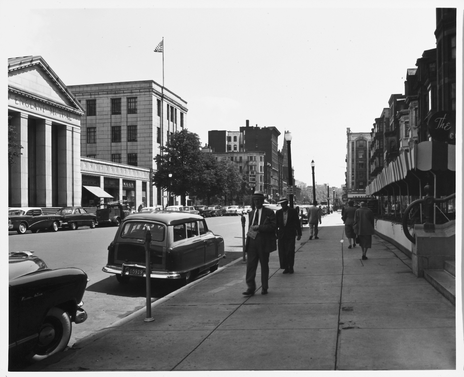 City and town life, Street lighting, Flags --United States, Back Bay (Boston, Mass.), Parking meters, Massachusetts Institute of Technology, Streetscapes, Pedestrians, Urban areas, Land use, Urban, City planning, Urban planning and environment, Documentary photography, Sidewalks, Berkeley to Boylston Streets, (Boston, MA), Kepes/Lynch Photograph Collection