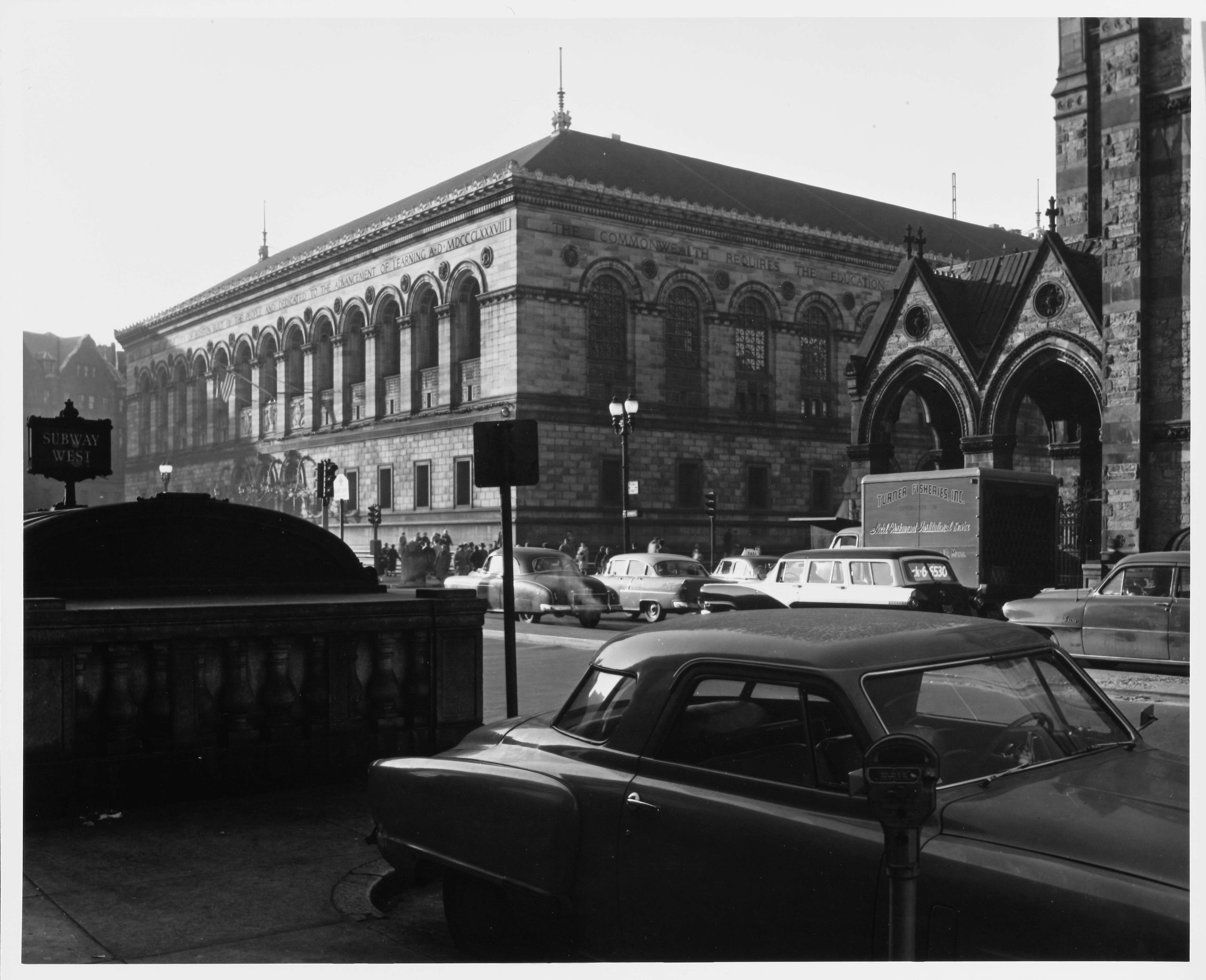Automobiles, Boston (Mass.), City and town life, Subway stations, Back Bay (Boston, Mass.), Massachusetts Institute of Technology, Streetscapes, Urban areas, City traffic, Land use, Urban, City planning, Urban planning and environment, Documentary photography, Boston Public Library, (Boston, MA), Dartmouth Street, (Boston, MA), Traffic intersections, Kepes/Lynch Photograph Collection, Old South Church (Boston, Mass.), Street lighting units