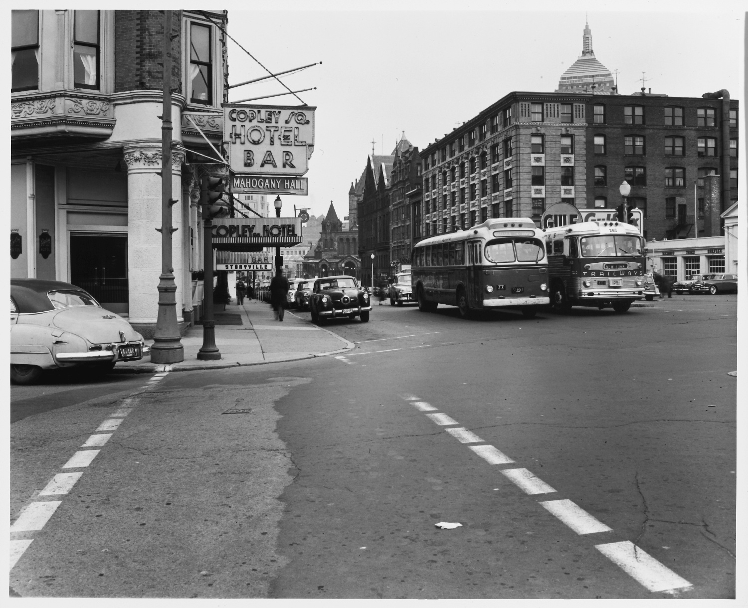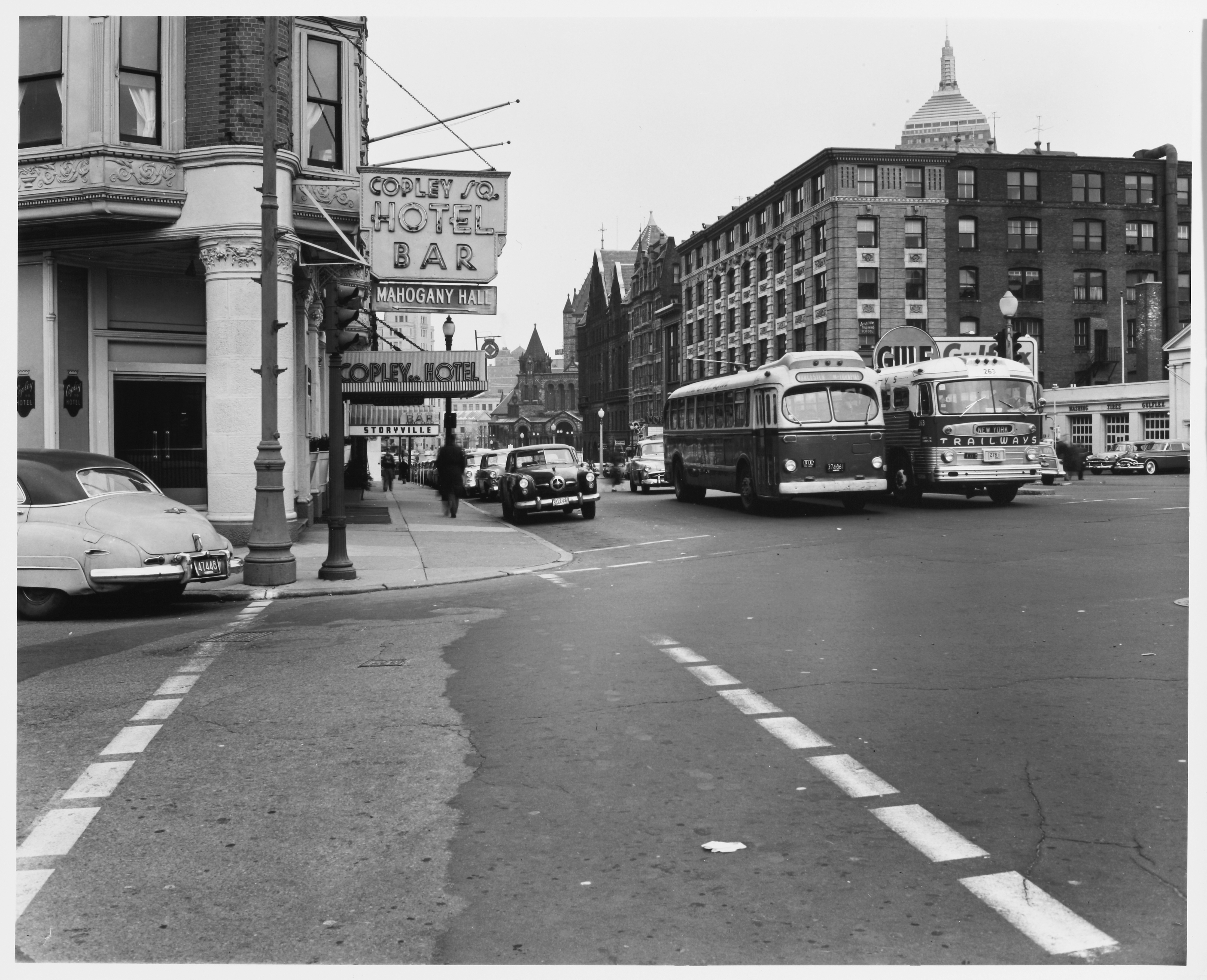 Automobiles, Hotels (Public accommodations), Shop signs, Boston (Mass.), Buses, City and town life, Back Bay (Boston, Mass.), Massachusetts Institute of Technology, Streetscapes, Urban areas, City traffic, Land use, Urban, City planning, Urban planning and environment, Documentary photography, Bars (commercial buildings), Huntington Avenue, Exeter Street to Copley Square, (Boston, MA), Traffic intersections, Kepes/Lynch Photograph Collection, Trinity Church (Boston, Mass.), Street lighting units