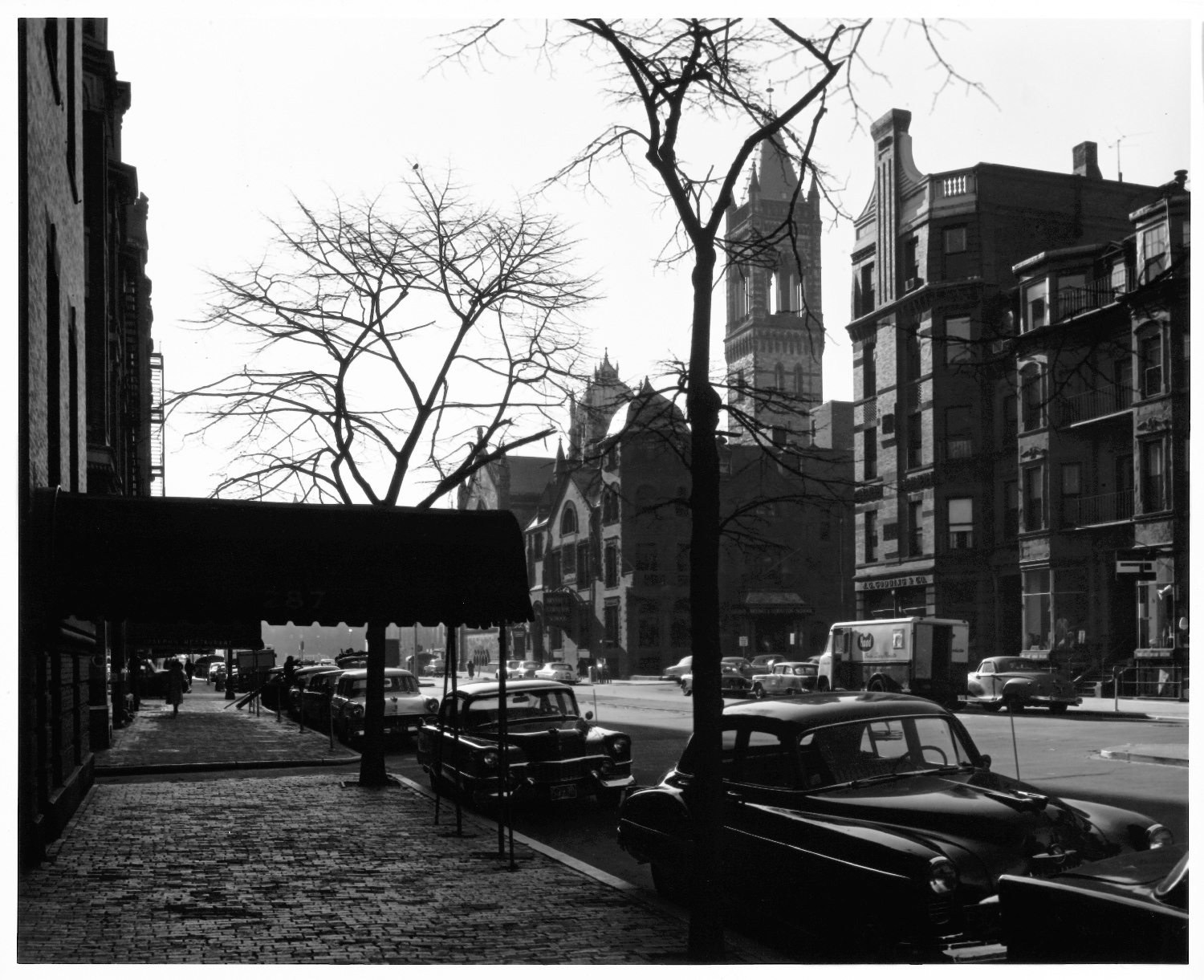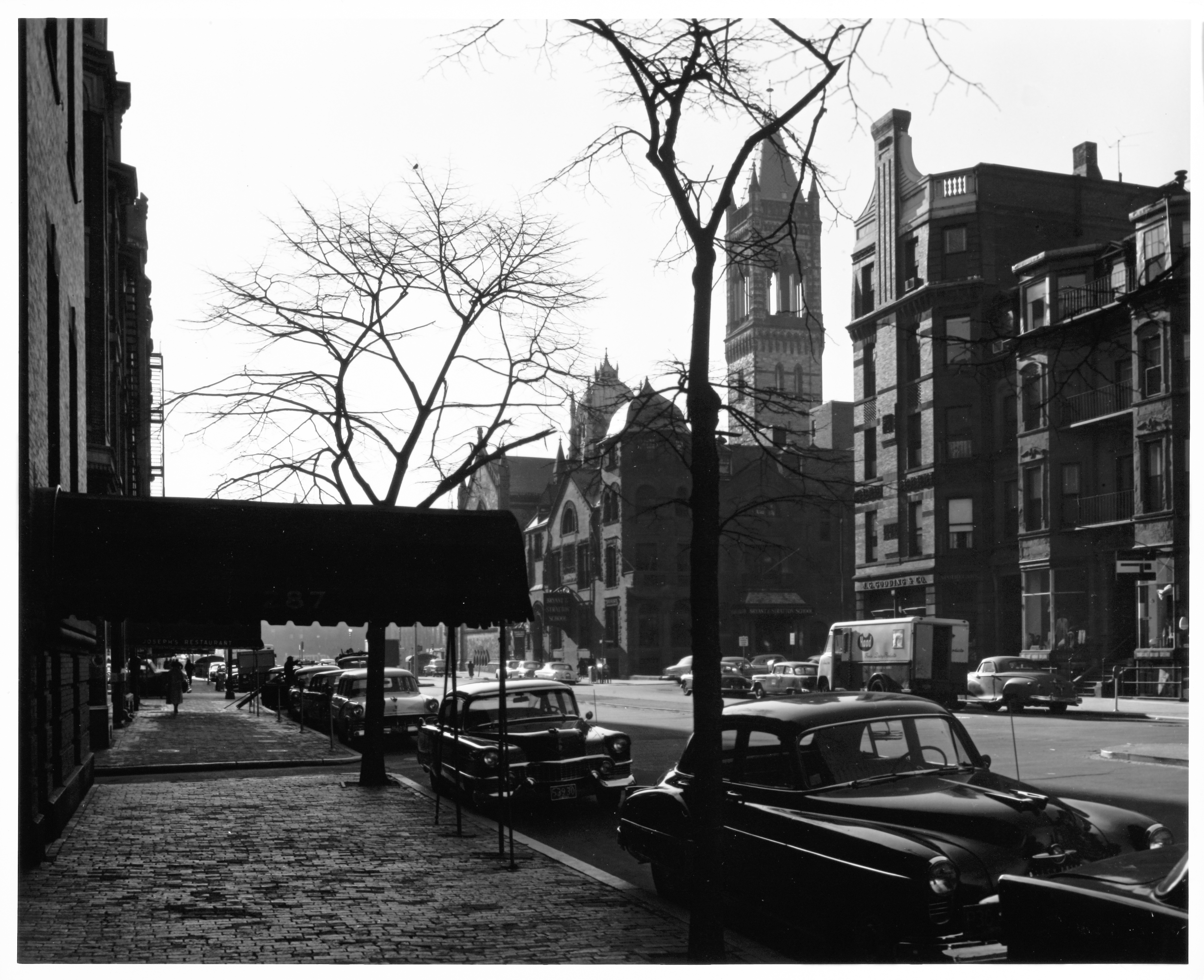 Automobiles, Trees, Trucks, Boston (Mass.), City and town life, Back Bay (Boston, Mass.), Massachusetts Institute of Technology, Streetscapes, Urban areas, Land use, Urban, City planning, Urban planning and environment, Documentary photography, Sidewalks, Dartmouth Street, (Boston, MA), Kepes/Lynch Photograph Collection, Old South Church (Boston, Mass.)