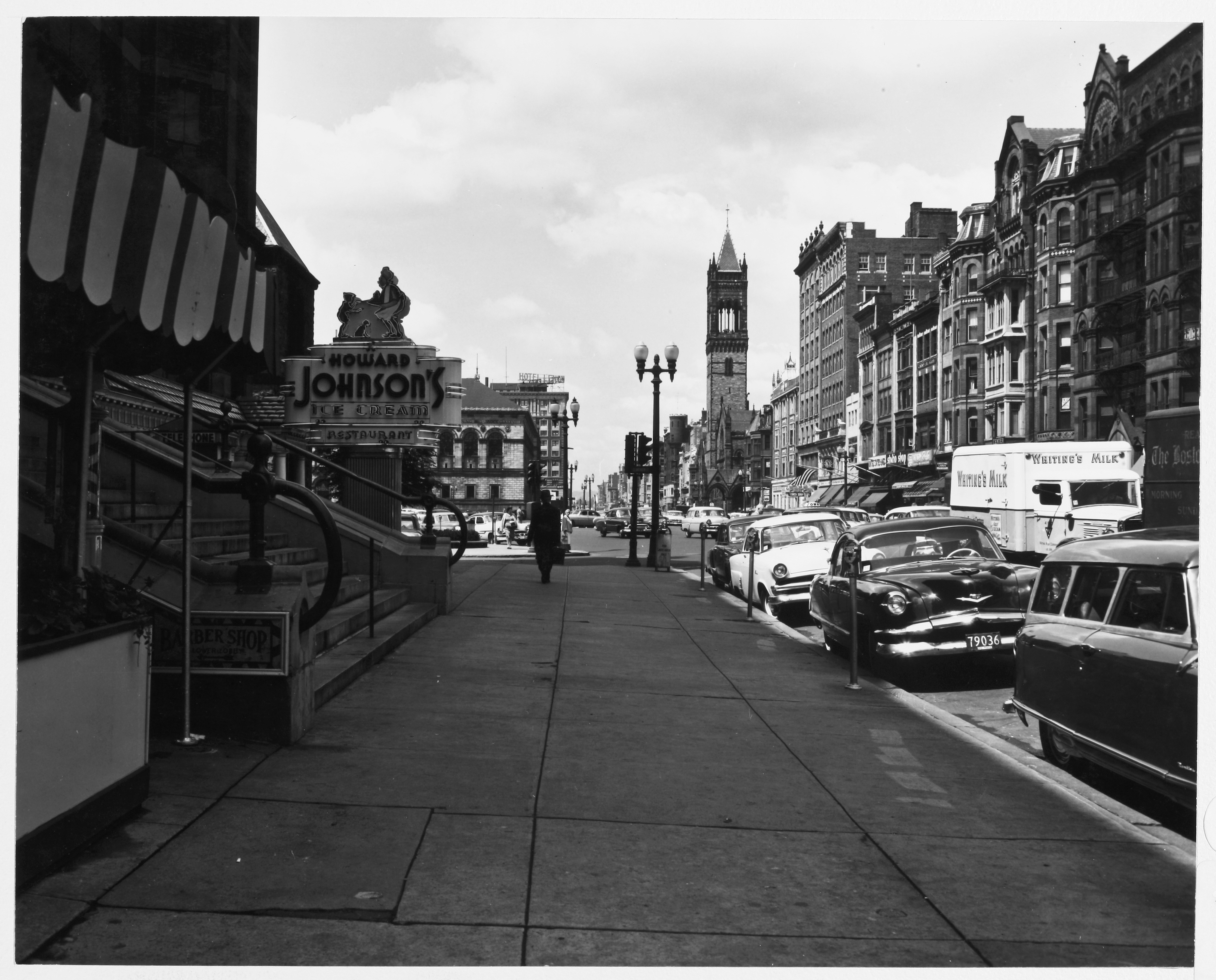 50 ft. Intervals, Boylston Street, Facing West, Sidewalk with Pedestrians, Howard Johnson's, Boston Public Library and Old South Church in Background