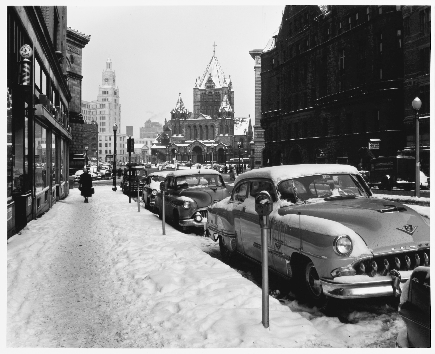 Automobiles, Shop signs, Stores, Retail, Boston (Mass.), Snow, City and town life, Back Bay (Boston, Mass.), Parking meters, Massachusetts Institute of Technology, Streetscapes, Urban areas, Land use, Urban, City planning, Urban planning and environment, Documentary photography, Copley Square (Boston, MA), Huntington Avenue, Exeter Street to Copley Square, (Boston, MA), Kepes/Lynch Photograph Collection, Trinity Church (Boston, Mass.), Street lighting units