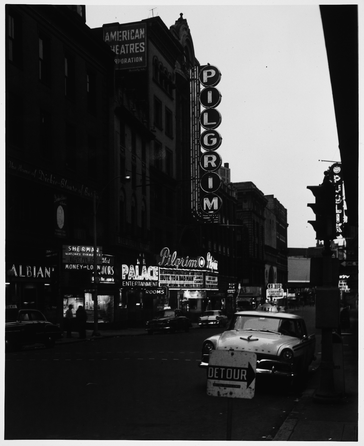 Motion picture theaters, Boston (Mass.), City and town life, Marquees, Traffic signs, Massachusetts Institute of Technology, Streetscapes, Urban areas, Land use, Urban, City planning, Neon signs, Urban planning and environment, Documentary photography, Kepes/Lynch Photograph Collection, Washington Street, Bennet Street to Adams Square, (Boston, MA)