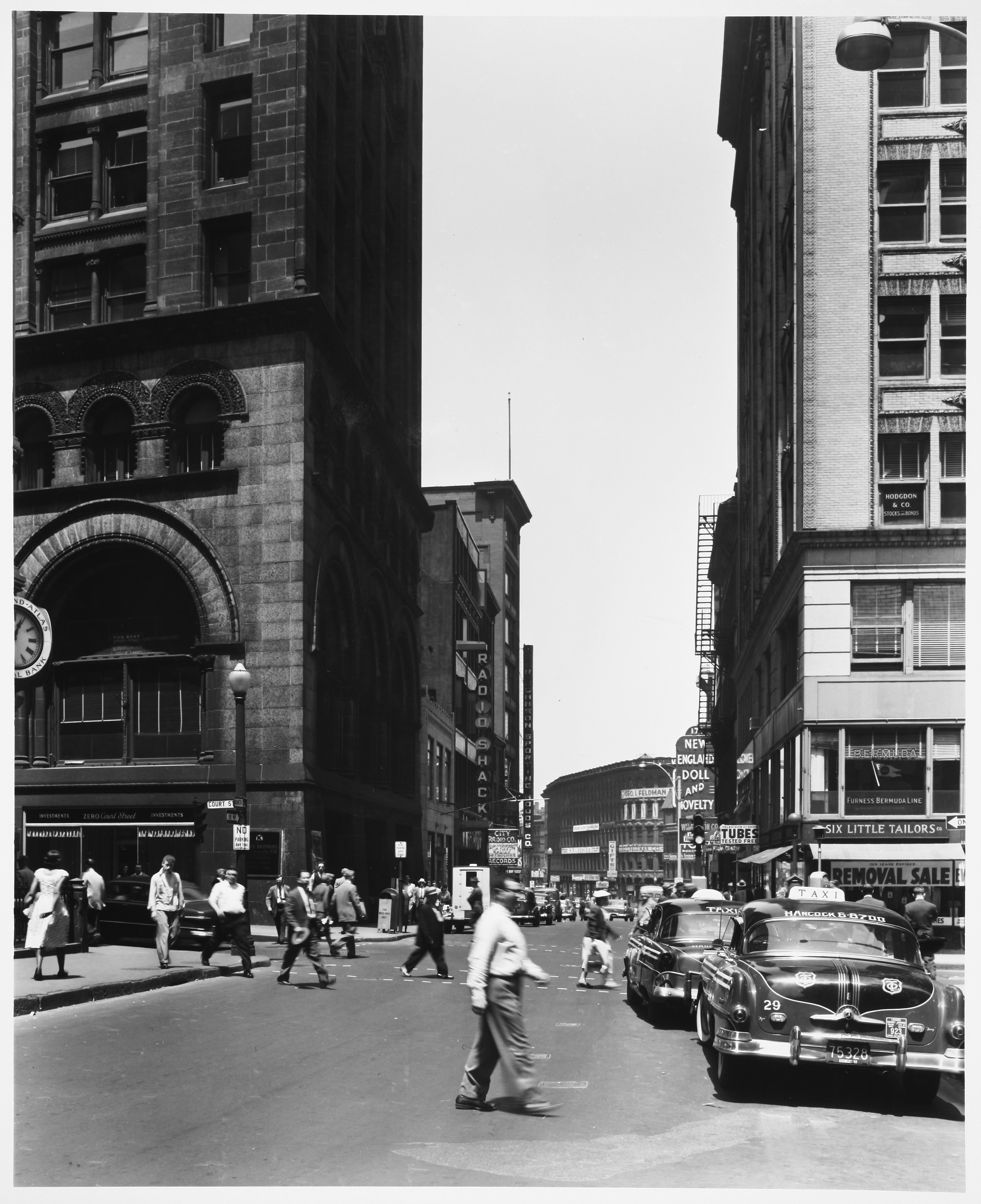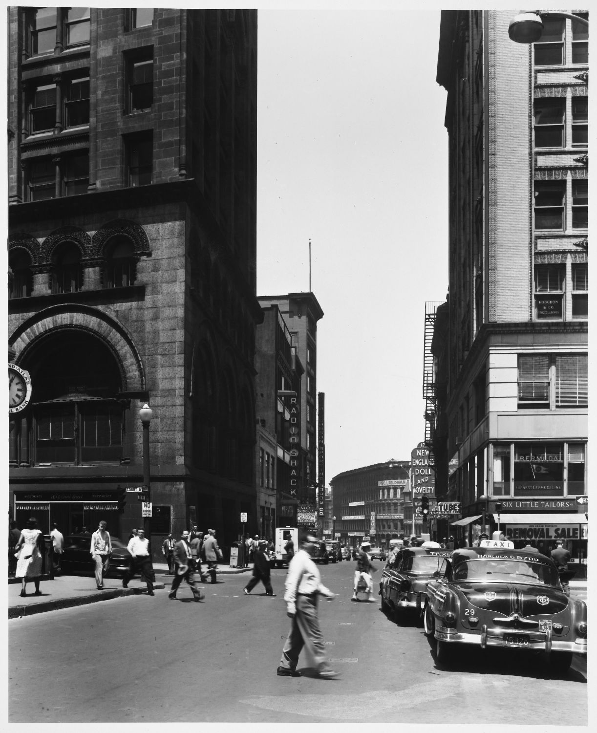 Boston (Mass.), City and town life, Taxicabs, Massachusetts Institute of Technology, Central business districts, Streetscapes, Pedestrians, Urban areas, City traffic, Land use, Urban, City planning, Urban planning and environment, Documentary photography, Kepes/Lynch Photograph Collection, Washington Street, Stuart Street to Adams Square, (Boston, MA), Crosswalks