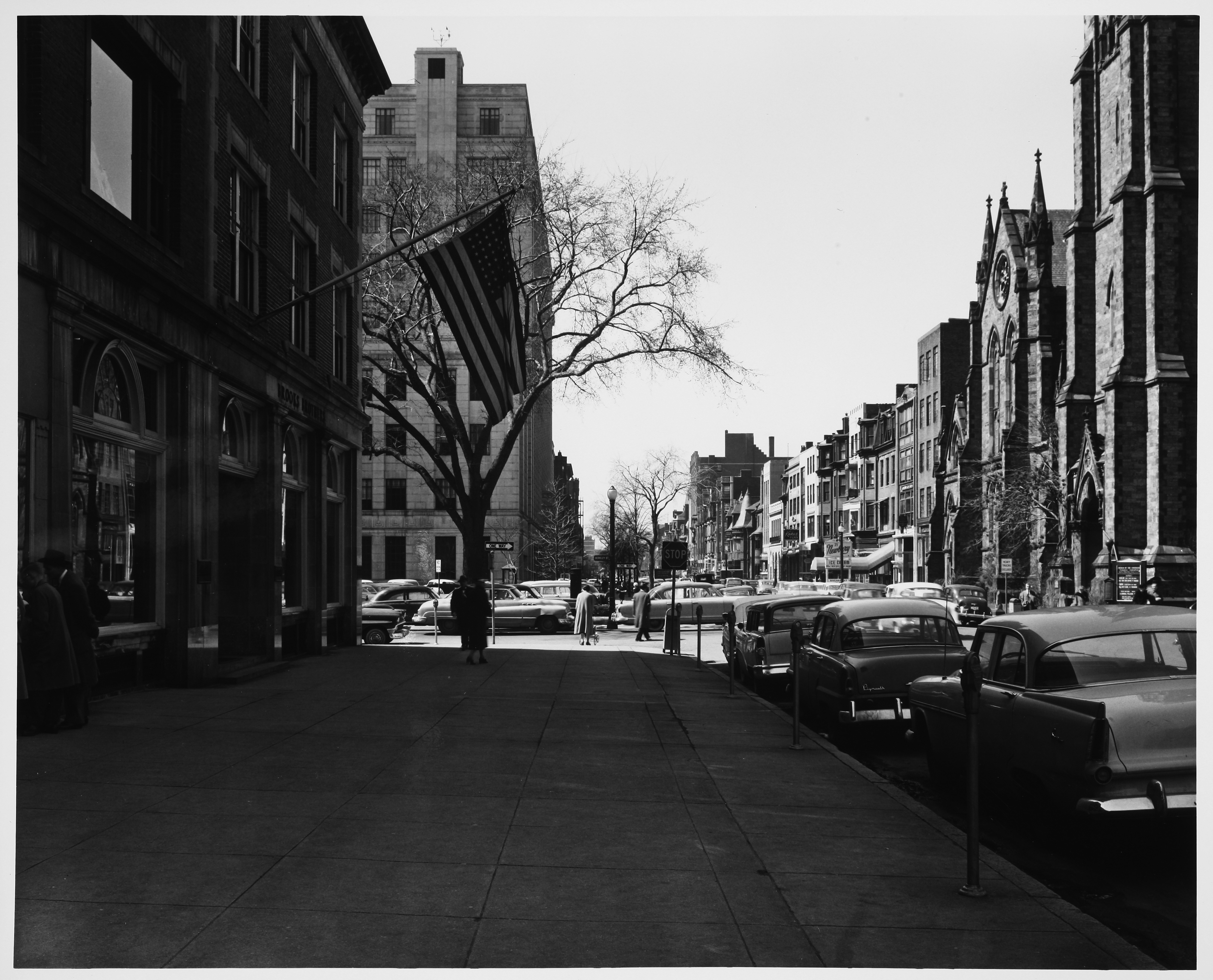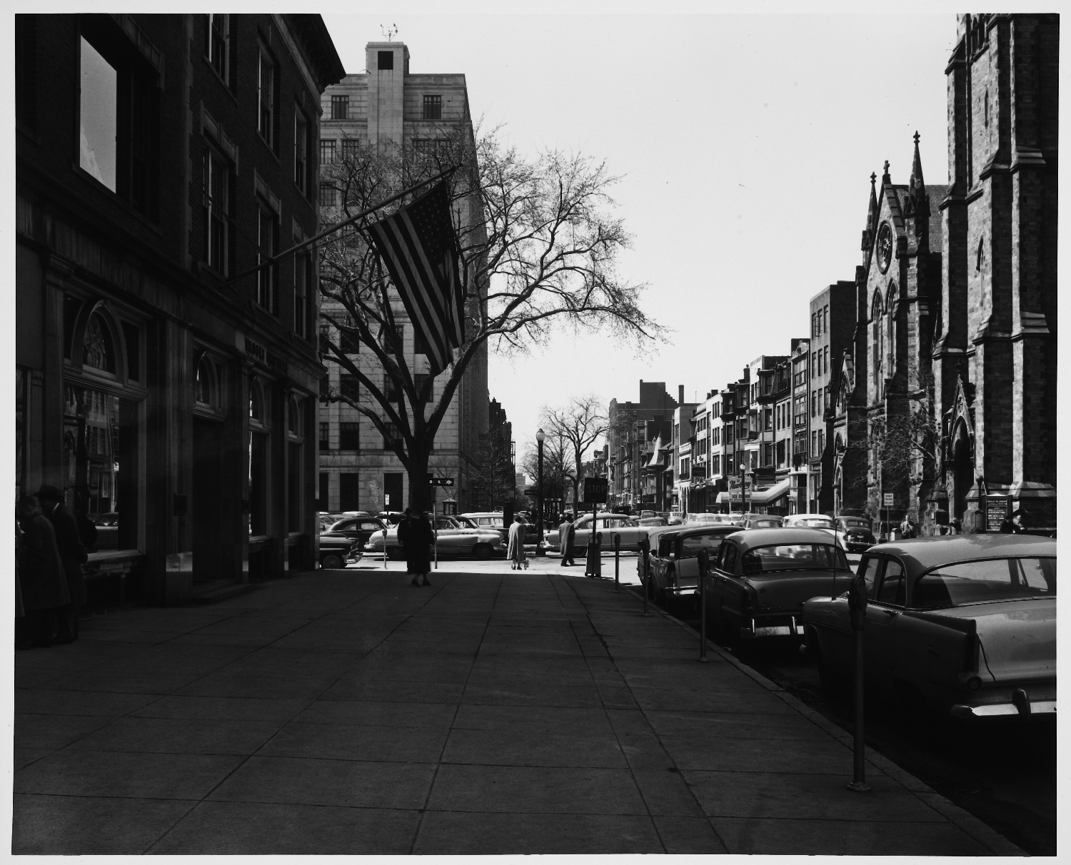 Automobiles, Stores, Retail, Boston (Mass.), City and town life, Clothing stores, Flags --United States, Back Bay (Boston, Mass.), Parking meters, Massachusetts Institute of Technology, Urban areas, Land use, Urban, City planning, Storefronts, Urban planning and environment, Documentary photography, Sidewalks, Newbury Street, Berkeley to Arlington, (Boston, MA), Kepes/Lynch Photograph Collection, Church of the Covenant (Church: Boston, Mass.), Street lighting units