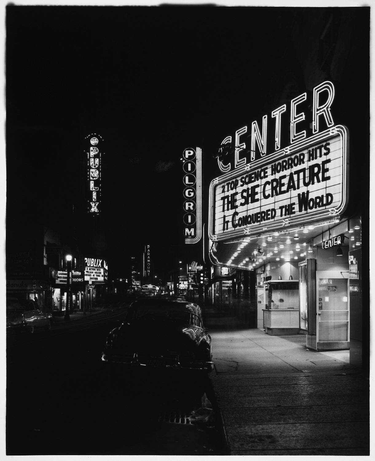 Night, Motion picture theaters, Boston (Mass.), City and town life, Marquees, Massachusetts Institute of Technology, Streetscapes, Urban areas, Land use, Urban, City planning, Neon signs, Urban planning and environment, Documentary photography, Kepes/Lynch Photograph Collection, Washington Street, Bennet Street to Adams Square, (Boston, MA)