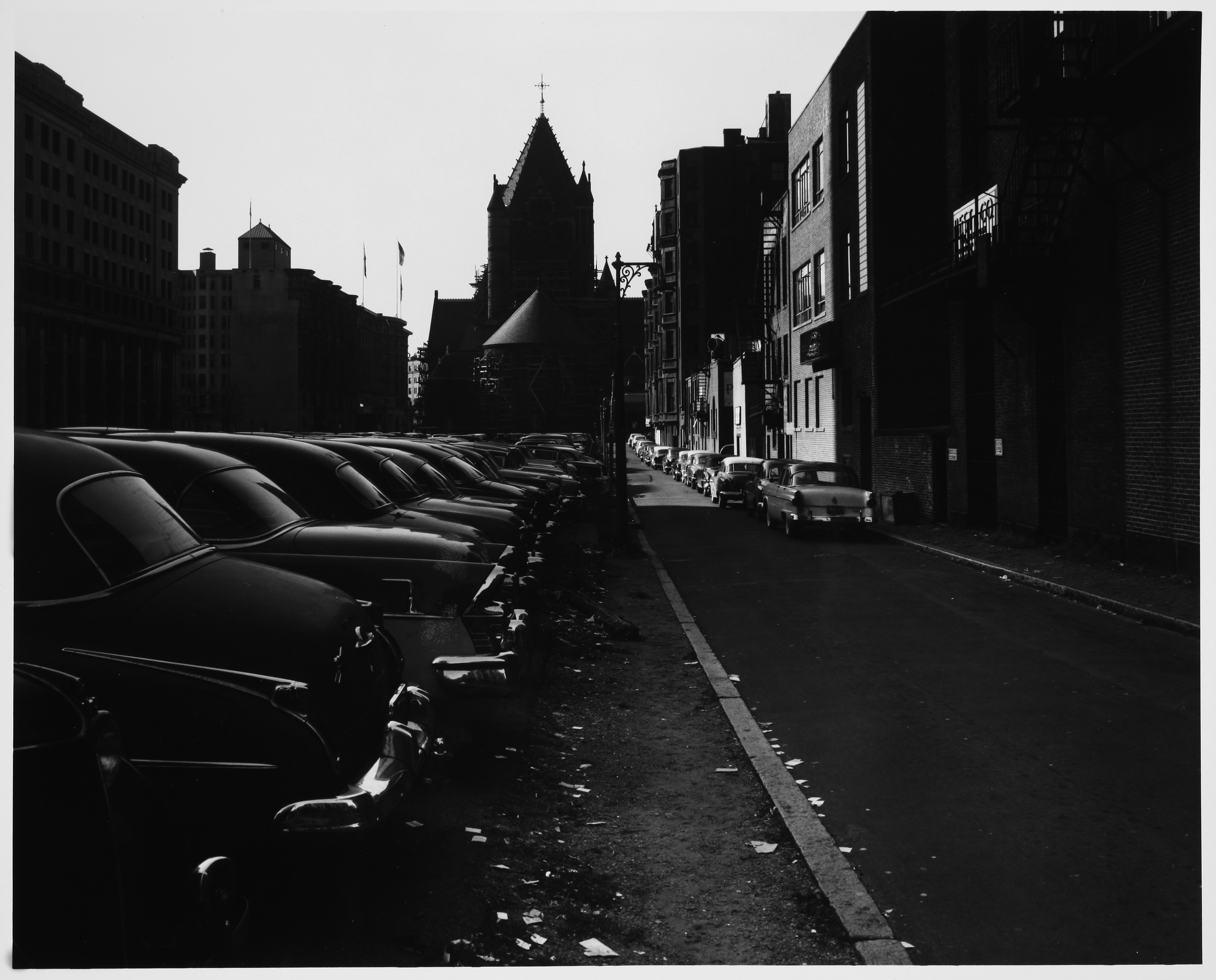 Automobiles, Construction repair, Boston (Mass.), City and town life, Parking lots, Back Bay (Boston, Mass.), Massachusetts Institute of Technology, Urban areas, Land use, Urban, City planning, Urban planning and environment, Documentary photography, Providence Street, Clarendon to Berkeley Streets, (Boston, MA), Kepes/Lynch Photograph Collection, Trinity Church (Boston, Mass.)