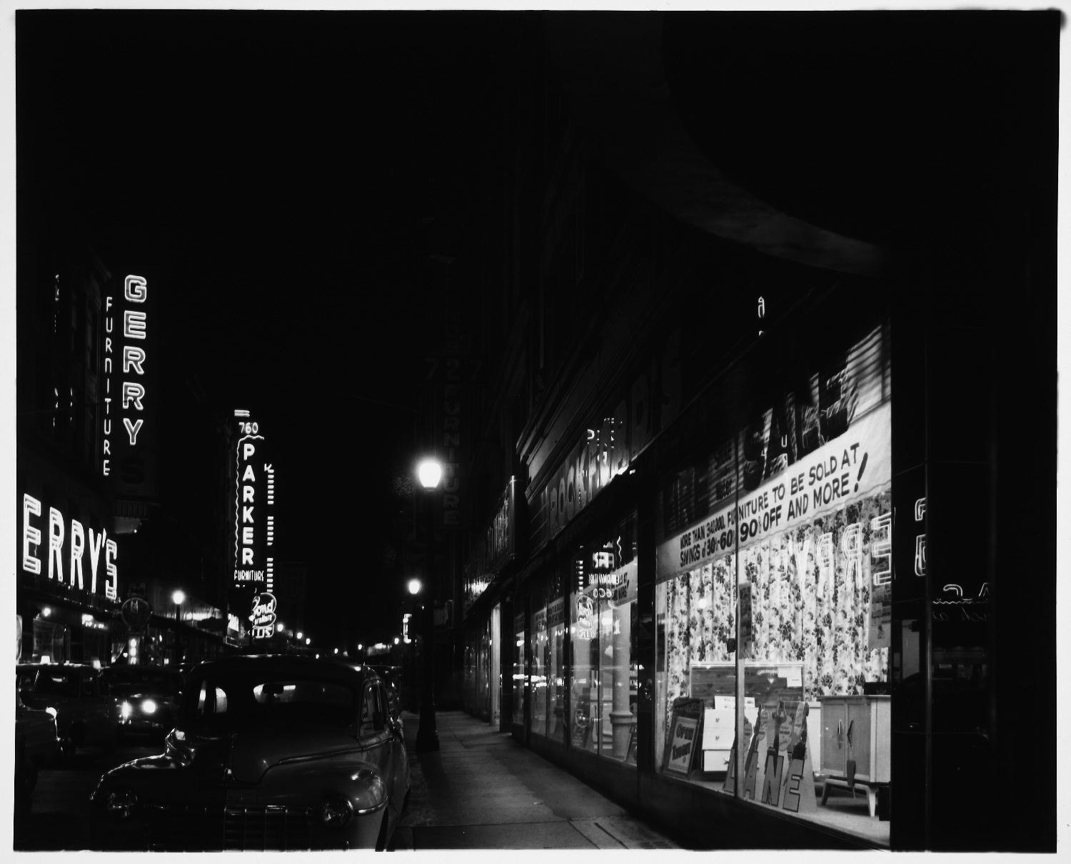 Night, Stores, Retail, Boston (Mass.), City and town life, Show-windows, Massachusetts Institute of Technology, Streetscapes, Urban areas, City traffic, Land use, Urban, City planning, Neon signs, Urban planning and environment, Documentary photography, Kepes/Lynch Photograph Collection, Washington Street, Bennet Street to Adams Square, (Boston, MA)