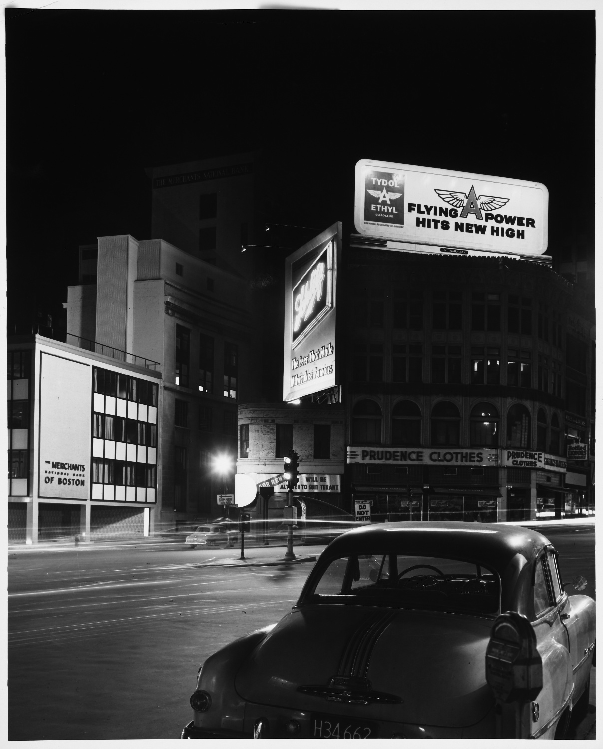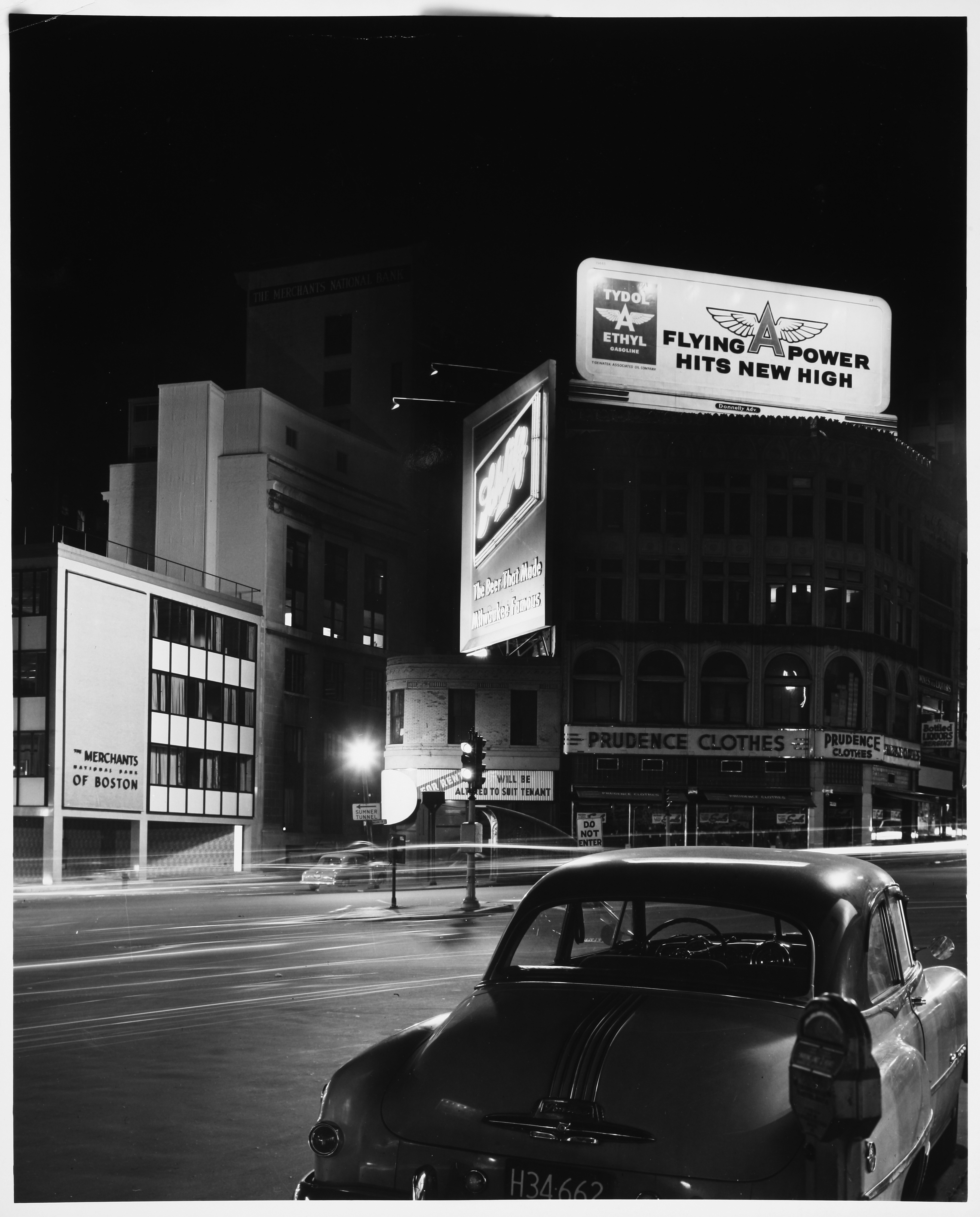 Billboards, Night, Boston (Mass.), Banks (Buildings), City and town life, Clothing stores, Parking meters, Massachusetts Institute of Technology, Central business districts, Intersections, Urban areas, Land use, Urban, City planning, Neon signs, Urban planning and environment, Documentary photography, Kepes/Lynch Photograph Collection, Washington Street, Bennet Street to Adams Square, (Boston, MA)