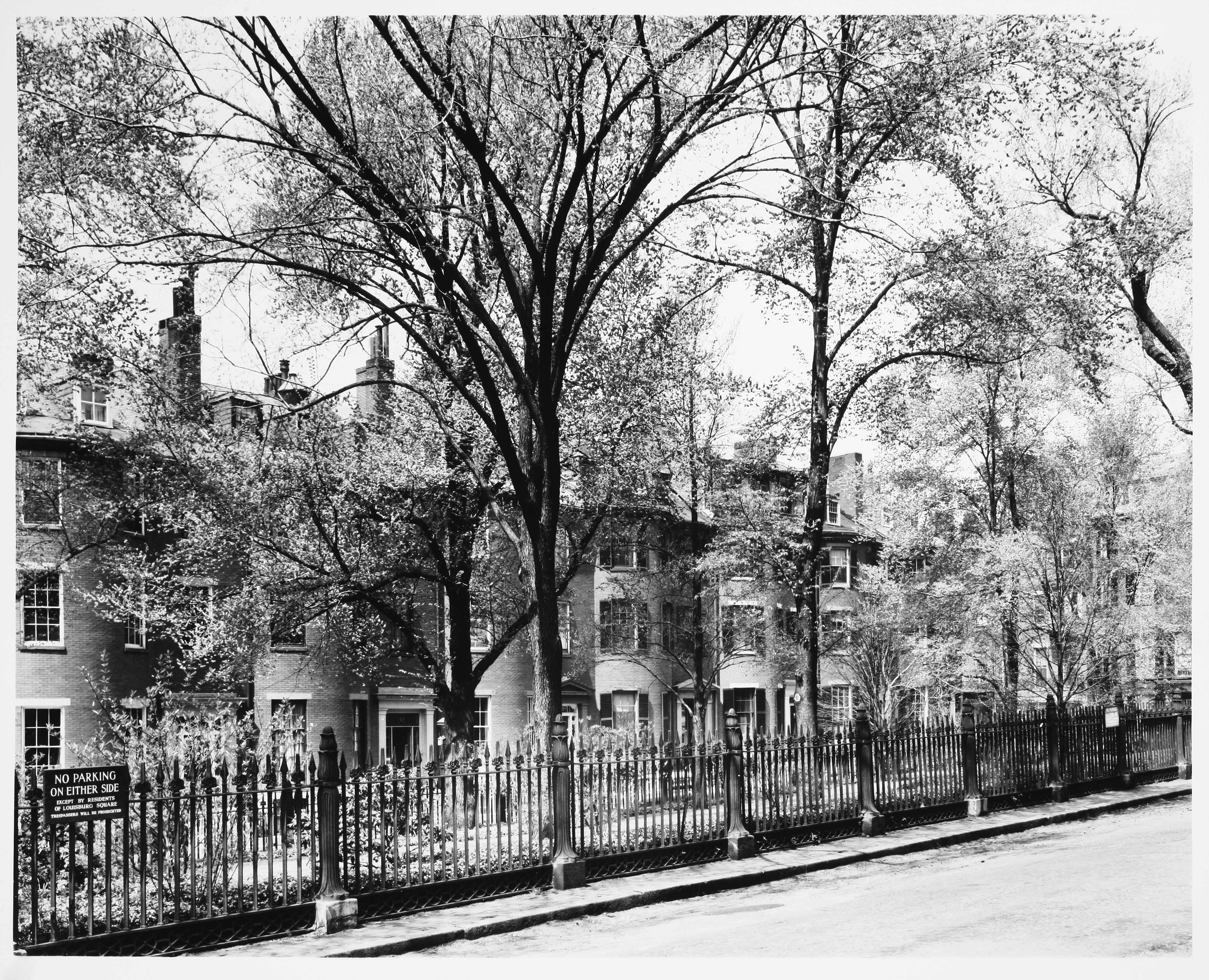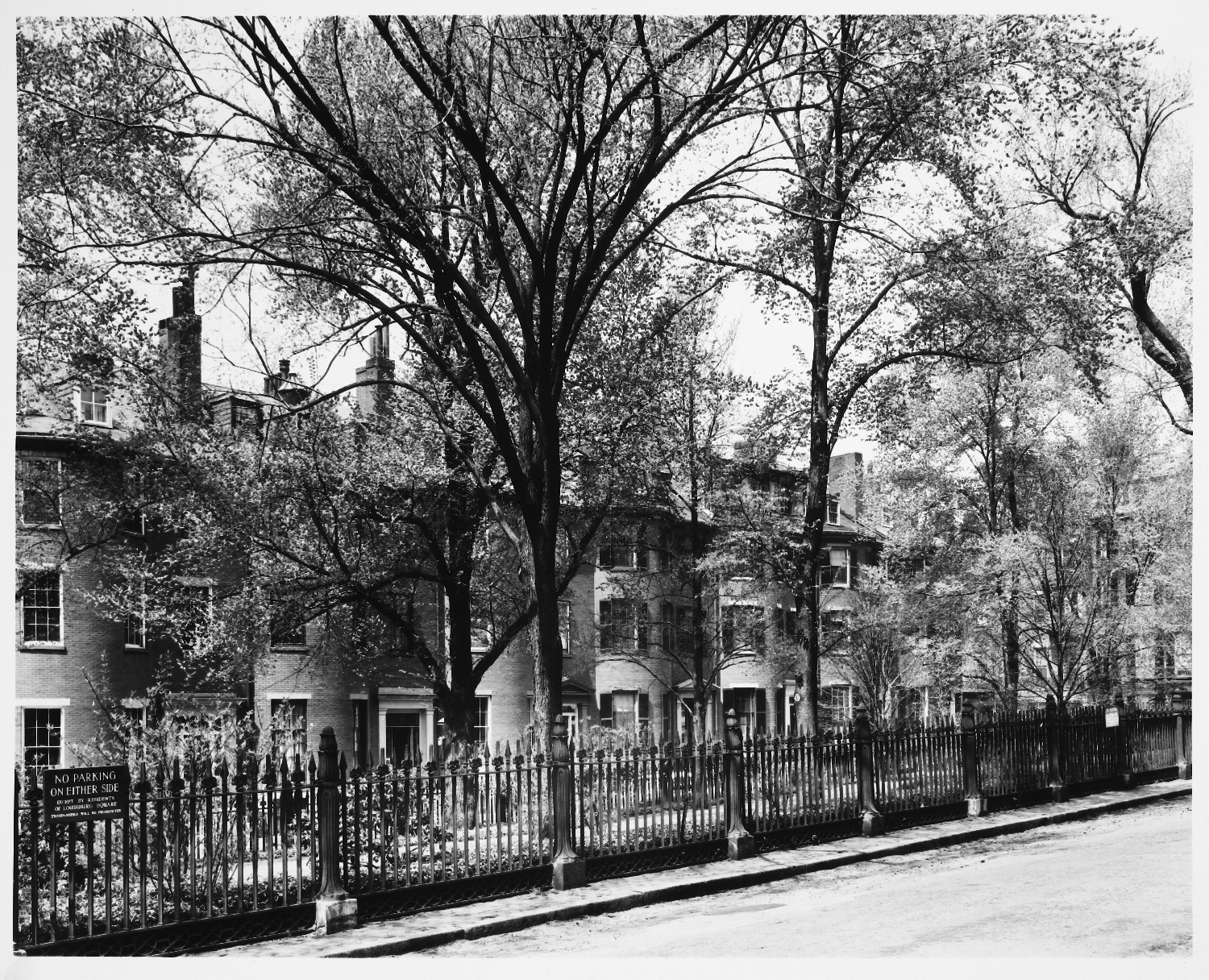 Beacon Hill, Louisburg Square, Stretch of Wrought Iron Fence, Tall Trees, Row Houses in Background, 10:45 A.M.