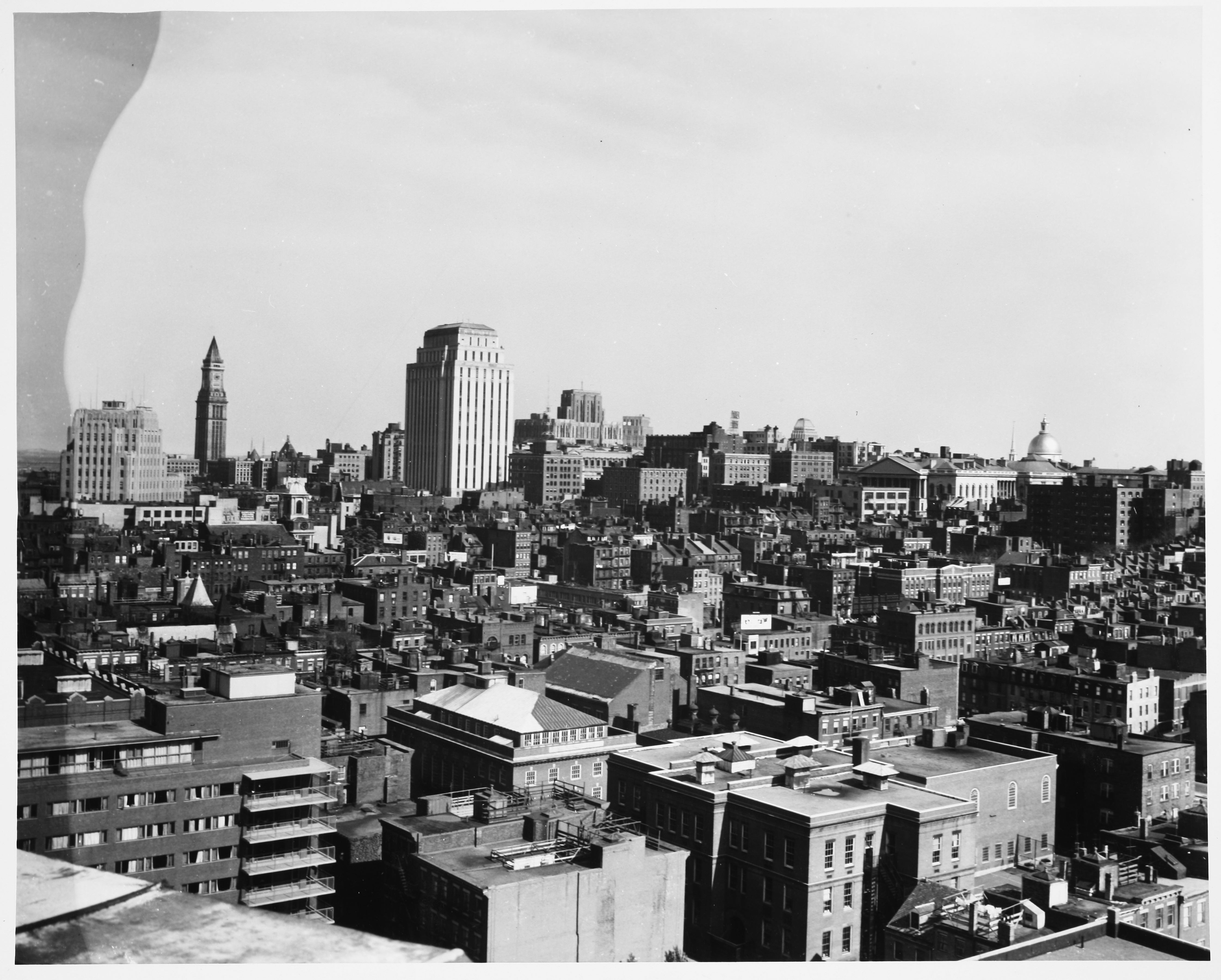 Boston (Mass.), City and town life, Massachusetts State House (Boston, Mass.), Massachusetts Institute of Technology, Urban areas, Land use, Urban, City planning, Urban planning and environment, Documentary photography, Rooftops, West End (Boston, Mass.), Aerial Views of Boston, (Boston, MA), Kepes/Lynch Photograph Collection
