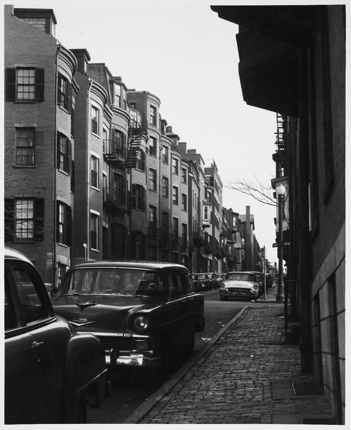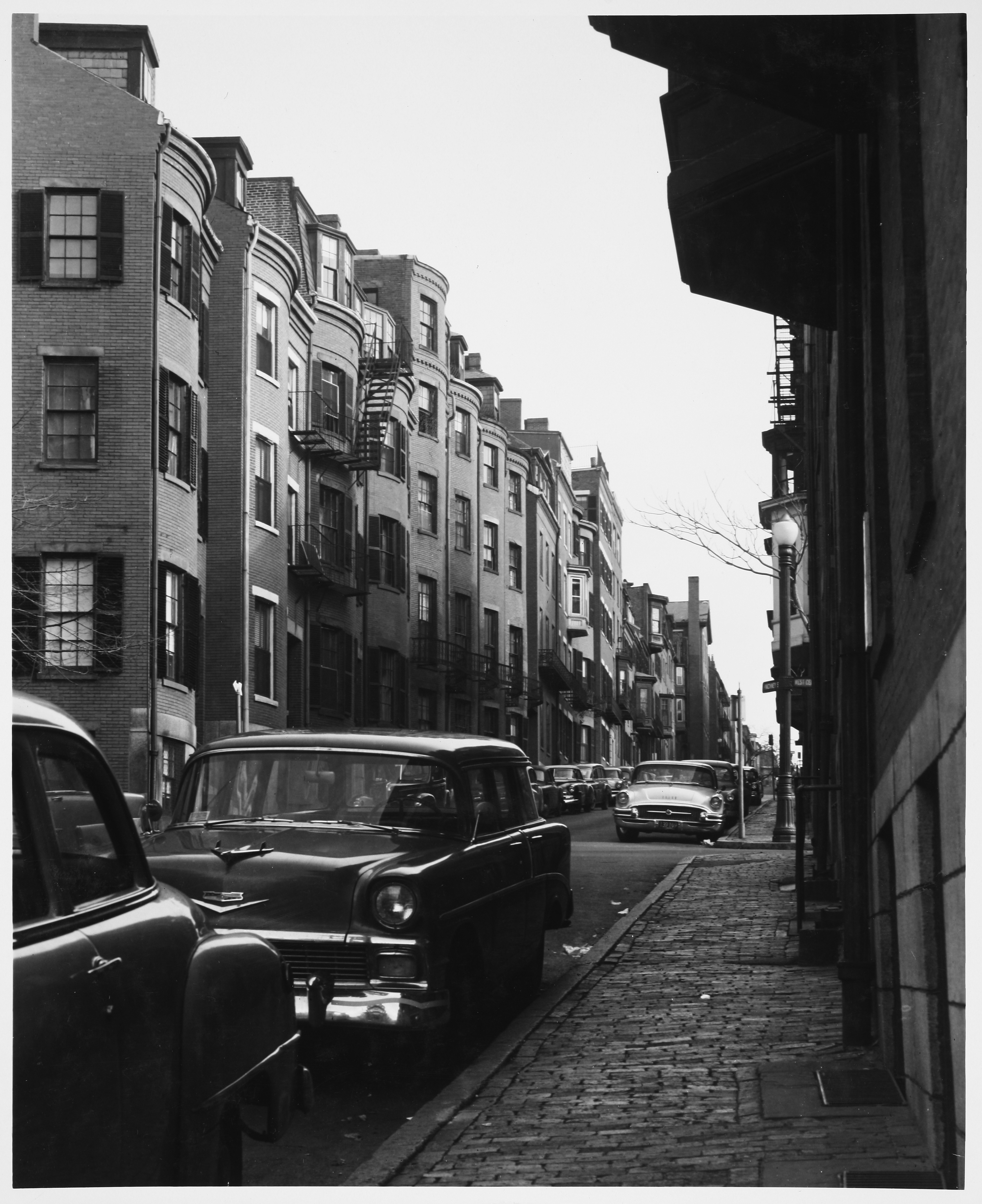 Brickwork, Boston (Mass.), City and town life, Town houses, Dormers, Bay windows, Massachusetts Institute of Technology, Urban areas, Land use, Urban, City planning, Urban planning and environment, Beacon Hill (Boston, Mass.), Documentary photography, Sidewalks, Kepes/Lynch Photograph Collection