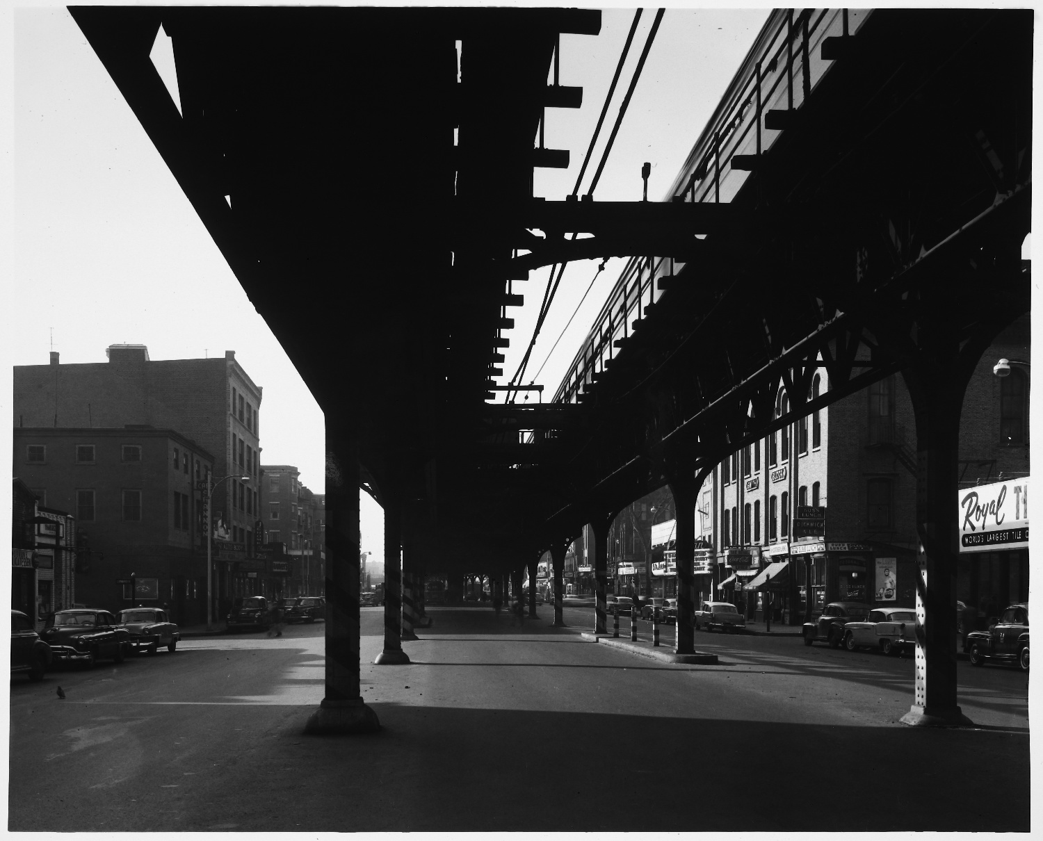 Automobiles, Shades and shadows, Shop signs, Boston (Mass.), City and town life, Massachusetts Institute of Technology, Urban areas, Land use, Urban, City planning, Storefronts, Urban planning and environment, Documentary photography, Railroads, elevated, Washington Street, Broadway to Massachusetts Avenue, (Boston, MA), Kepes/Lynch Photograph Collection