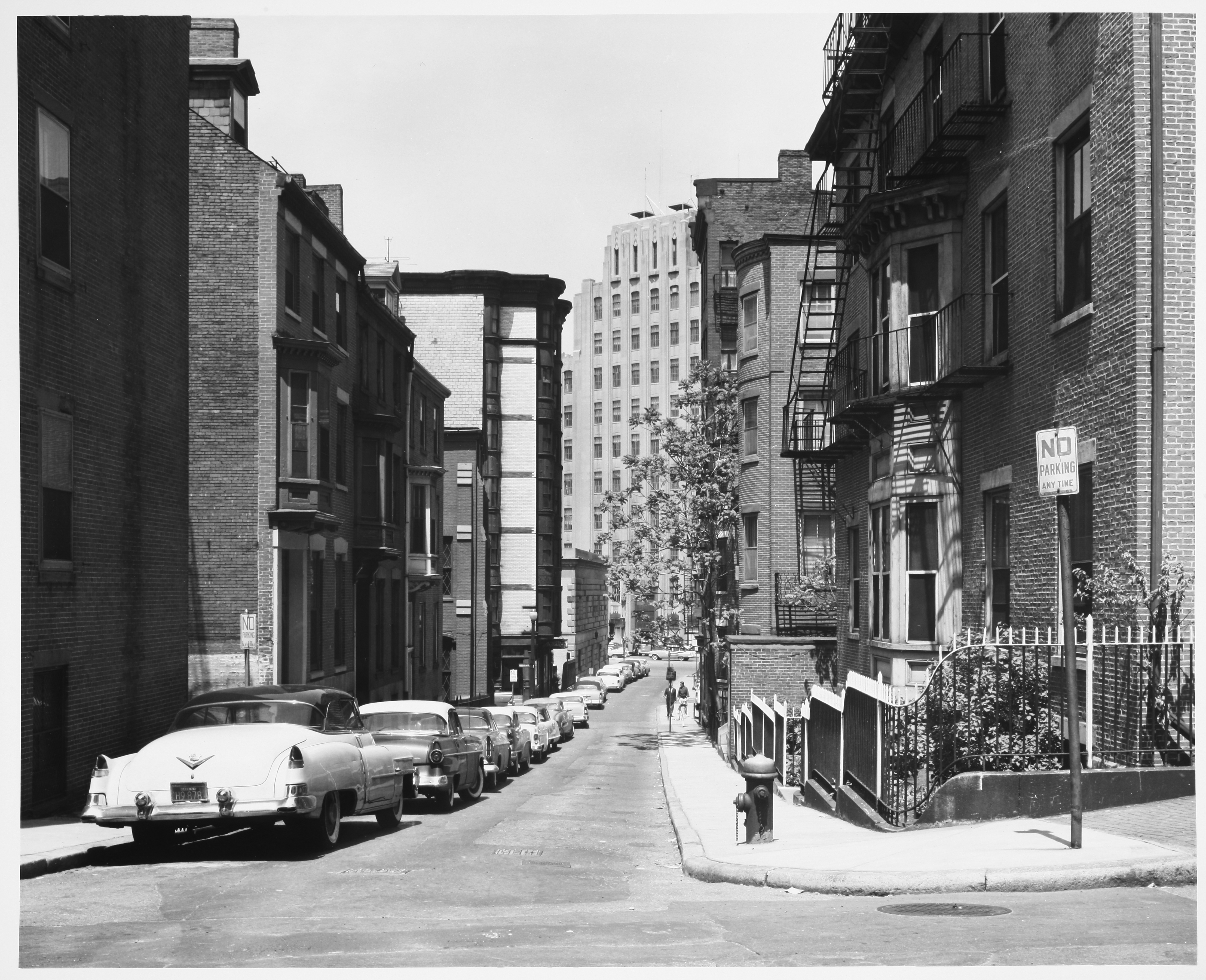 Brickwork, Automobiles, Boston (Mass.), City and town life, Traffic signs, Row houses, Multistory buildings, Bay windows, Massachusetts Institute of Technology, Urban areas, Land use, Urban, City planning, Urban planning and environment, Beacon Hill (Boston, Mass.), Documentary photography, Kepes/Lynch Photograph Collection
