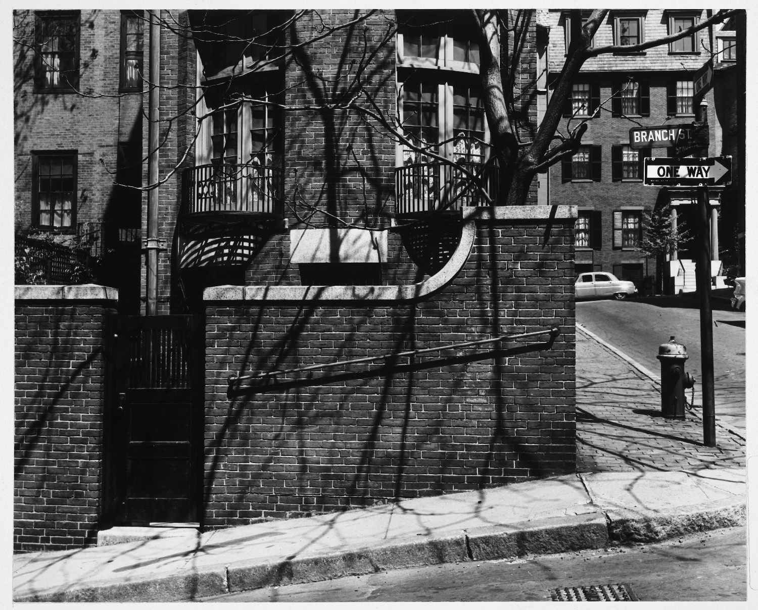 Beacon Hill, Branch Street Corner of Spruce Street, Looking North, Gated Tall Brick Wall, Setback Row House