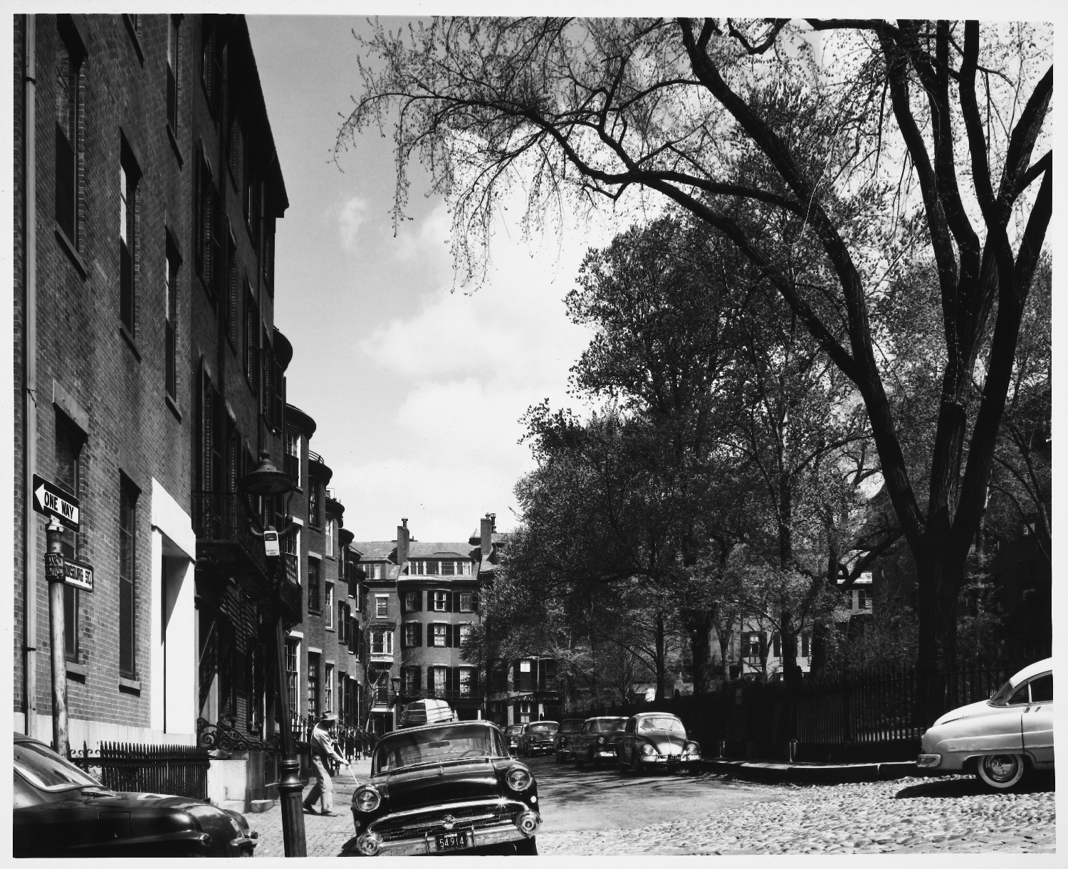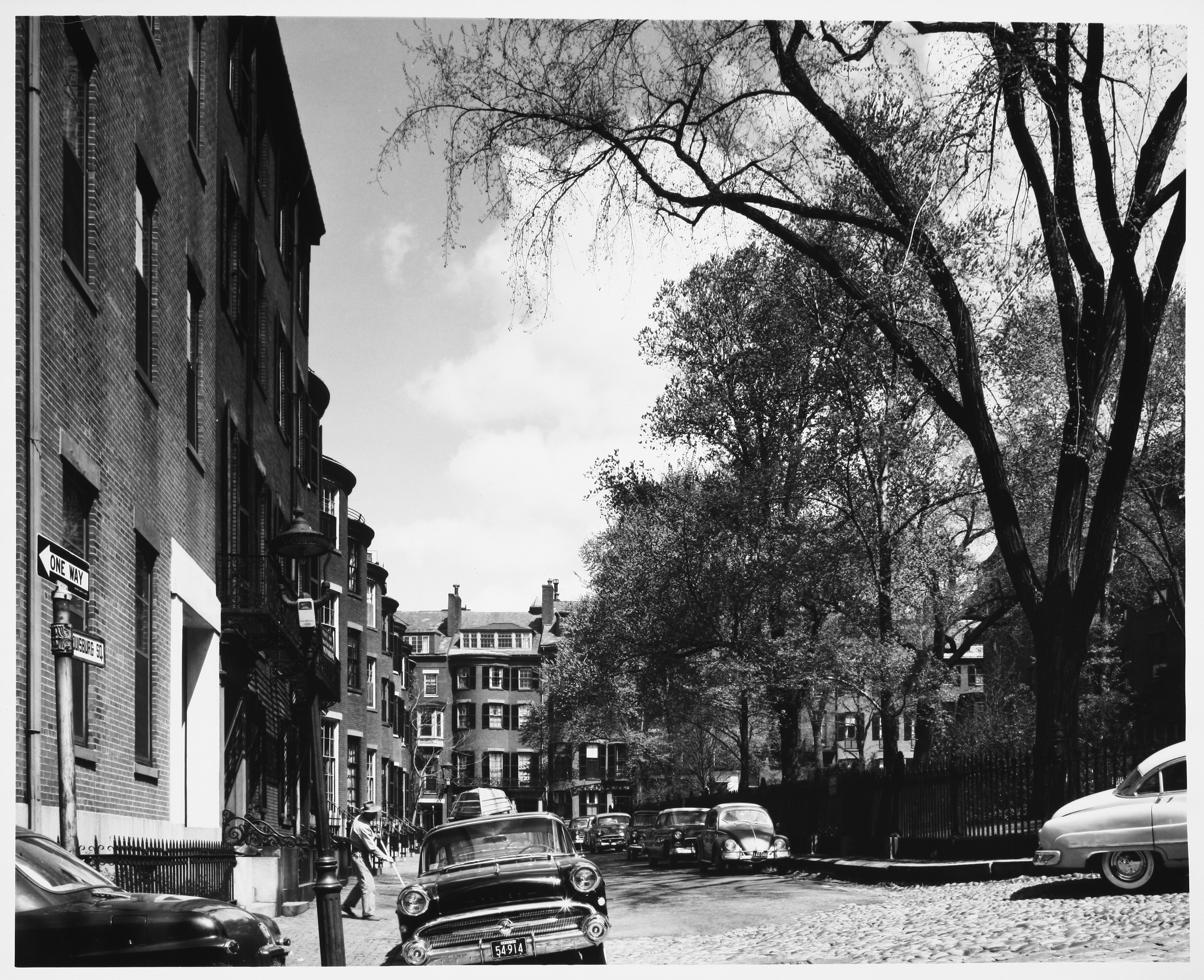Brickwork, Automobiles, Boston (Mass.), City and town life, Town houses, Wrought iron, Traffic signs, Massachusetts Institute of Technology, Urban areas, Land use, Urban, City planning, Urban planning and environment, Beacon Hill (Boston, Mass.), Documentary photography, Kepes/Lynch Photograph Collection