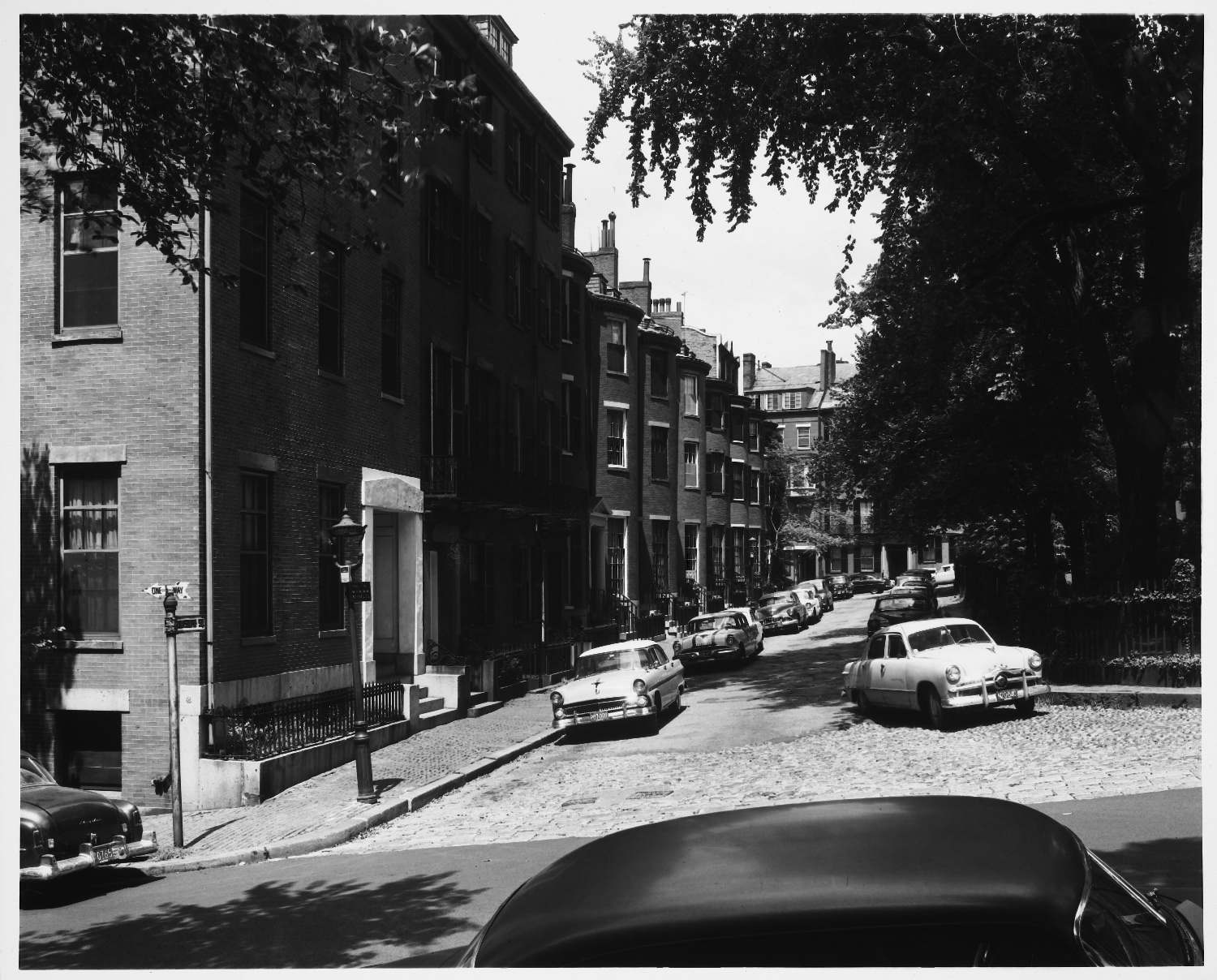 Brickwork, Trees, Boston (Mass.), City and town life, Town houses, Traffic signs, Massachusetts Institute of Technology, Urban areas, Land use, Urban, City planning, Urban planning and environment, Beacon Hill (Boston, Mass.), Documentary photography, Sidewalks, Kepes/Lynch Photograph Collection