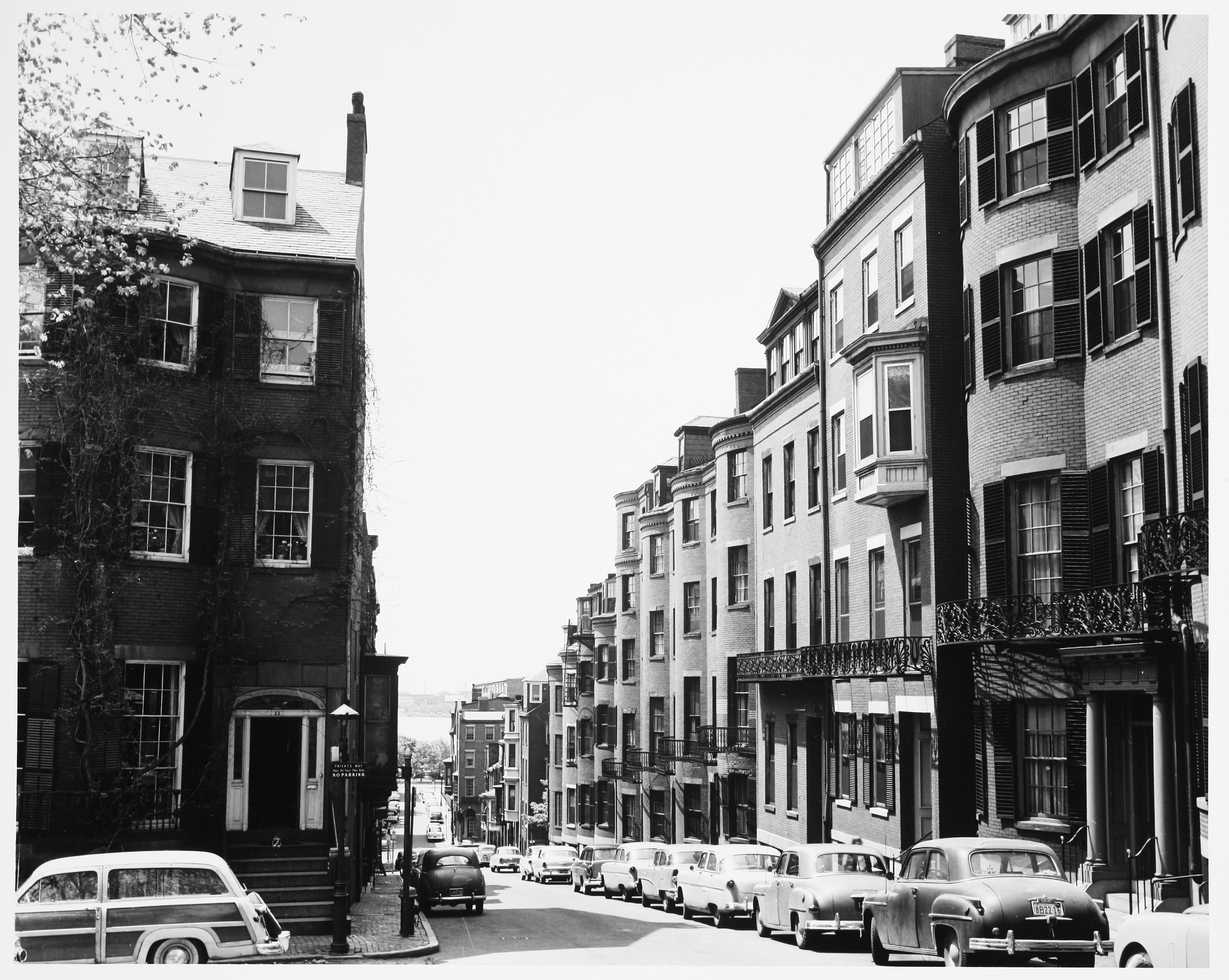 Automobiles, Boston (Mass.), City and town life, Brick, Dormers, Row houses, Massachusetts Institute of Technology, Urban areas, Land use, Urban, City planning, Urban planning and environment, Beacon Hill (Boston, Mass.), Documentary photography, Kepes/Lynch Photograph Collection