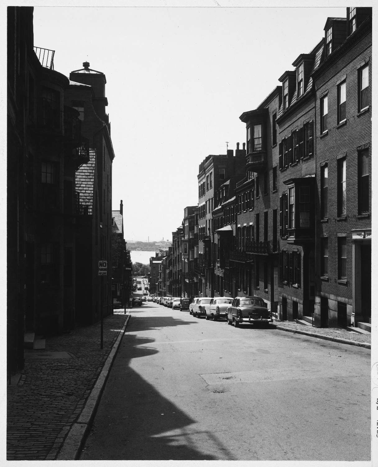 Brickwork, Boston (Mass.), City and town life, Town houses, Traffic signs, Dormers, Bay windows, Massachusetts Institute of Technology, Urban areas, Land use, Urban, City planning, Urban planning and environment, Beacon Hill (Boston, Mass.), Documentary photography, Sidewalks, Kepes/Lynch Photograph Collection