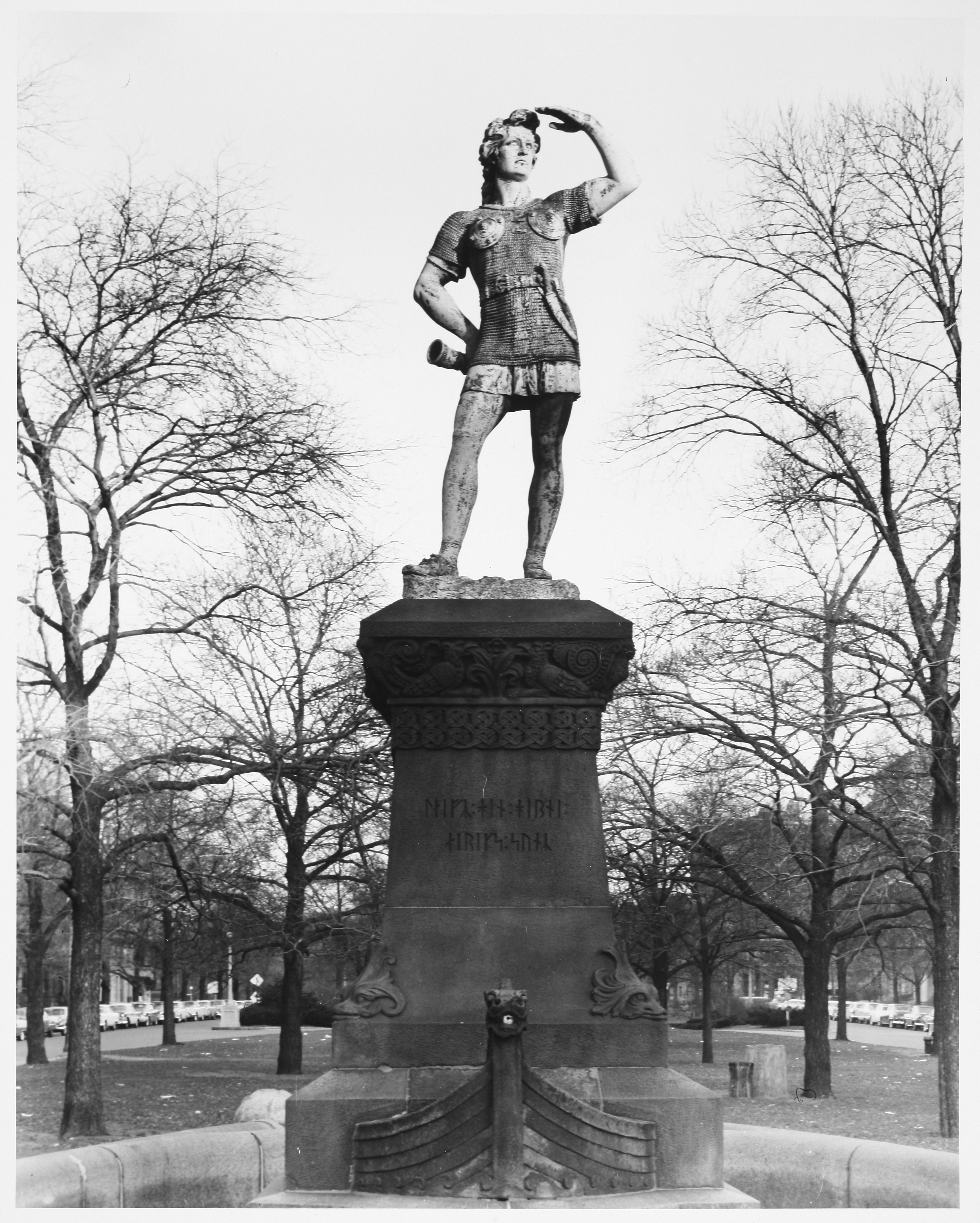 Inscriptions, Trees, Monuments, Boston (Mass.), City and town life, Statues, Stone carving, Pedestals, Massachusetts Institute of Technology, Figurative art, Urban areas, Land use, Urban, City planning, Urban planning and environment, Documentary photography, Kepes/Lynch Photograph Collection, Commonwealth Ave. (Boston, MA), Monuments and Statues (Boston, Mass. and Surrounding Areas), Ericson, Leif, d. ca. 1020