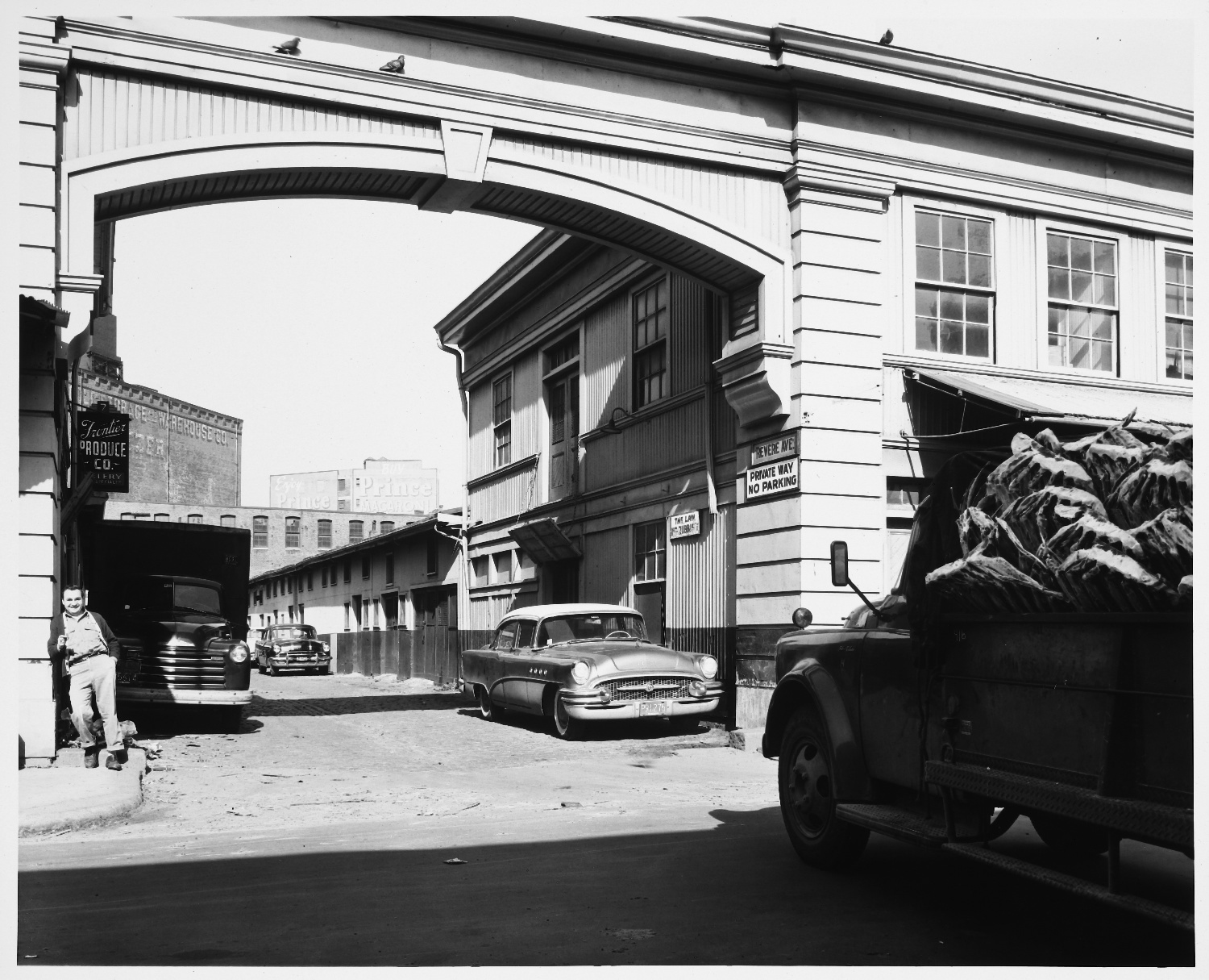 Arches, Automobiles, Trucks, Warehouses, Windows, Industrial buildings, Shop signs, Boston (Mass.), City and town life, Massachusetts Institute of Technology, Urban areas, Land use, Urban, City planning, Urban planning and environment, Documentary photography, Sidewalks, Grid Series, Kepes/Lynch Photograph Collection