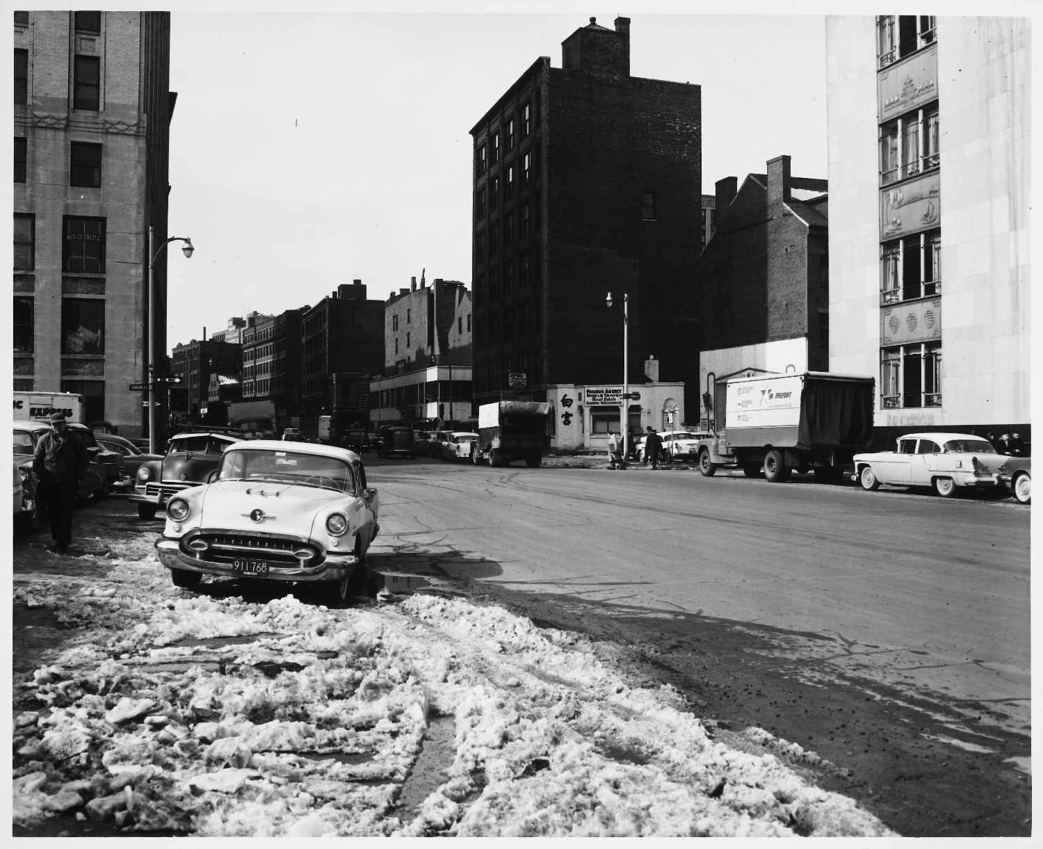 Automobiles, Trucks, Shop signs, Boston (Mass.), City and town life, Massachusetts Institute of Technology, Streetscapes, Pedestrians, Urban areas, Land use, Urban, City planning, Urban planning and environment, Documentary photography, Sidewalks, Grid Series, Kepes/Lynch Photograph Collection, Street lighting units, Mixed use, Chinatowns