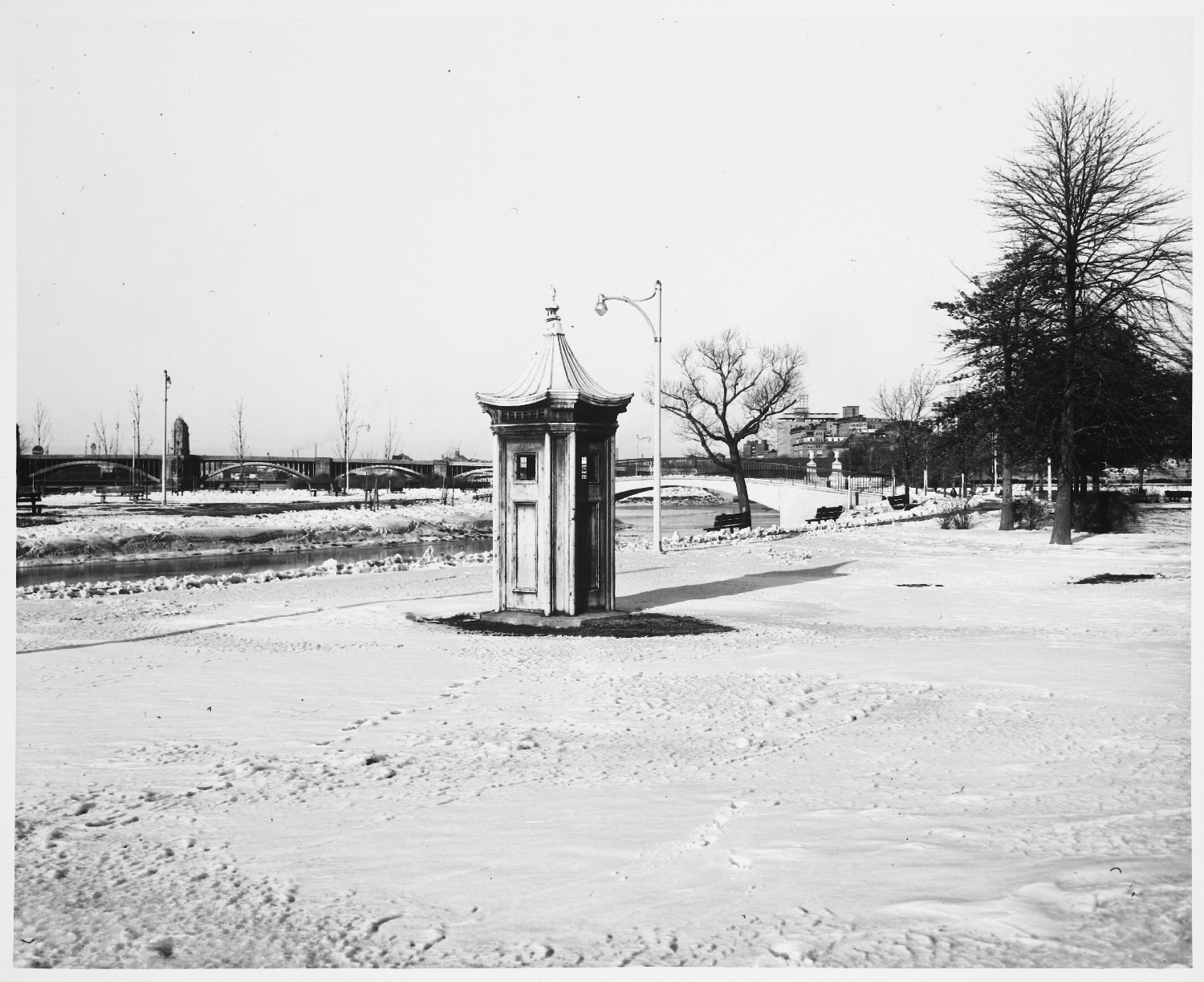 Parks, Boston (Mass.), Snow, City and town life, Footbridges, Benches, Charles River (Mass.), Promenades (walkways), Massachusetts Institute of Technology, Pedestrian areas, Urban areas, Land use, Urban, City planning, Urban planning and environment, Documentary photography, Longfellow Bridge (Boston and Cambridge, Mass.), Grid Series, Kepes/Lynch Photograph Collection